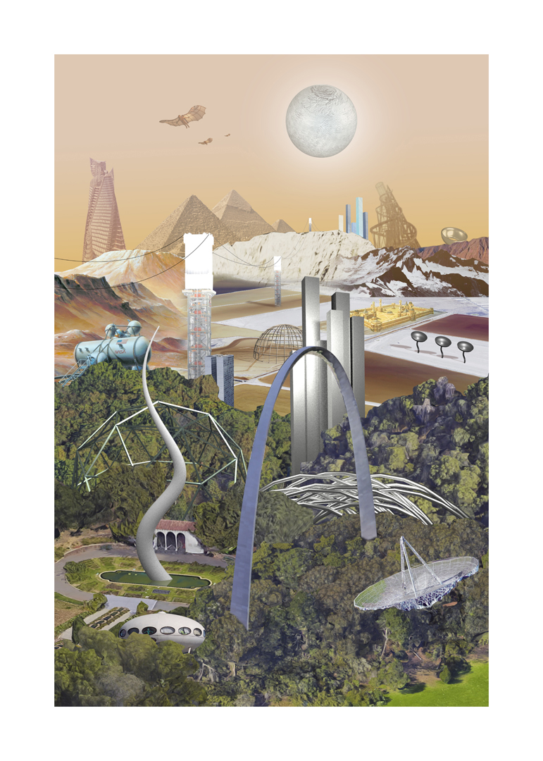 An homage to utopian thought, this collage includes a NASA image of Mars, one of Leonardo's flying machines, the pyramids of Giza, an inverted image of Luis Barragan's Torres de Satélite, Tatlin's Monument to the Third International, towers from the Ivanpah solar facility, an illustration of New Harmony, a Mars vehicle from a NASA illustration, salt flats in Utah, the Gateway Arch, the Futuro House, buildings from Brasilia, the Stanford Dish, the Morcom Amphitheater of Roses, and some imaginary things modeled in 3D by artist Jenny Odell.