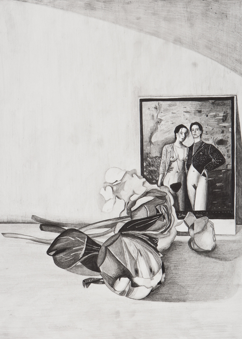 The postcard in this still life drawing is an image of Jan Saudek’s 1988 photograph Sisters in Arms (Gabina & Annabelle Farová). When artist Libby Black saw this postcard, she thought the women were lovers. She also associated the title Sisters with how two women together are often addressed as sisters, cousins, friends, and so on, instead of lovers. The flowers in the still life drawing are for Jen, Black’s lover.