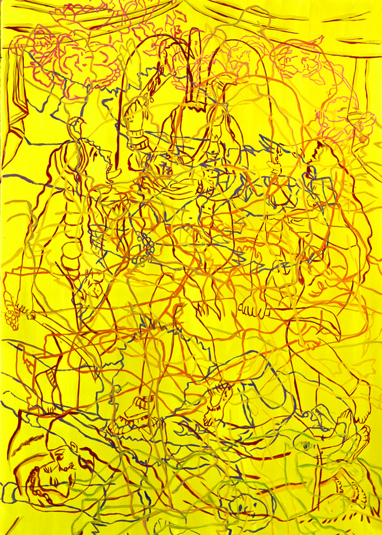 Ranu Mukherjee’s painting, Body Language, is made of overlaid lines in saturated ground. The piece intertwines source material from an 1885 Calcutta Art Studio print of the Tantric deity Chinnamasta, with contemporary expressions of physical movement, eroticism, and theatricality.
