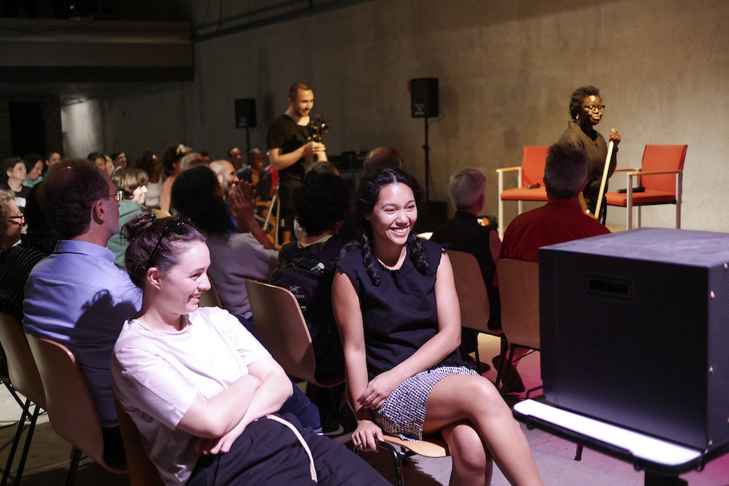 During a later TBA artist panel, Knight shared that the origin of Sanity TV dates to a residency during which she had felt stuck, unsure of how to best make use of the studio space she was provided, as someone who works in performance. She began staging interviews with a chair as her subject, filming these exercises as part of an imagined talk show called Sanity TV; the title originated from her questioning her own sanity as the sessions became more involved. Eventually, Knight interviewed other artists, and she has performed Sanity TV with audiences in several cities. This iteration appeared especially stripped-down, with the audience sitting in plastic chairs in a presentation room at the Pacific Northwest College of Art; previously it had taken place in theaters with traditional seating rows, sometimes with Knight conducting interviews on a stage. Knight has said her performance work is sometimes informed by her prior training in psychodynamic therapy. Her host character is often brazenly provocative with her audience but never actually cruel—a tactic that may have been cultivated through this mode of therapy work. Sanity TV generates a palpable tension and uneasiness, but by frequently cutting that tension with collective laughter, Knight creates an awareness of the less-than-sane logic governing the time and space we inhabit—and she has fun poking holes in it.