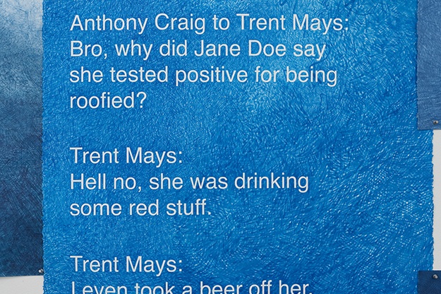 PM: The way the drawing is laid out in the gallery, you read the texts in the order that the events are unfolding, you see the first attempts to reframe and lie about what happened, and you start to realize the extent to which the pictures and the news of what happened are spreading [amongst the teenagers]. When I was about two-thirds of the way through the drawing, reading all of this, I had to sit down. Because that’s where it really hit home: On all sides, there was absolute unwillingness to acknowledge what happened as rape. It’s overwhelming to read their words and see Trent Mays becoming increasingly defensive. He’s prevaricating, telling one person one thing, telling another person another thing—blowing it off. He’s not worried. And that makes it that much worse. He’s not thinking about what he’s done, he just wants it to go away.