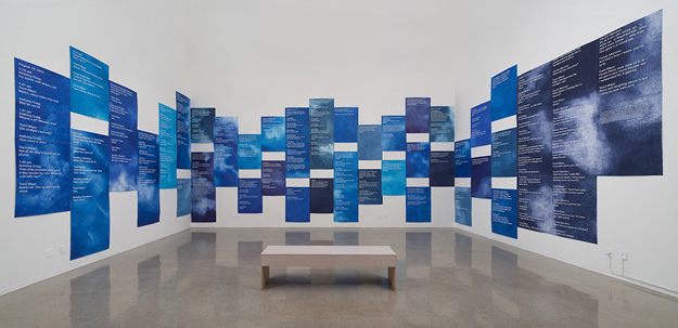 Patricia Maloney: Let’s start with the large-scale drawings on view at Pitzer College. They are the transcriptions of the text messages that were used as evidence during the Steubenville rape trial. Writ so large, they are frightening in terms of the indifference expressed toward the assault that has taken place. How were you able to spend so much time with these words in order to make these drawings?