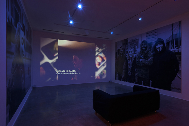 PM: The video—which is on view at Pomona—is, as you mentioned, a collection of found footage from the media. Included in the space are these very large-scale photos of demonstrators who are part of the hacktivist group Anonymous and who played a crucial role in bringing this case to widespread attention and ultimately to prosecution.