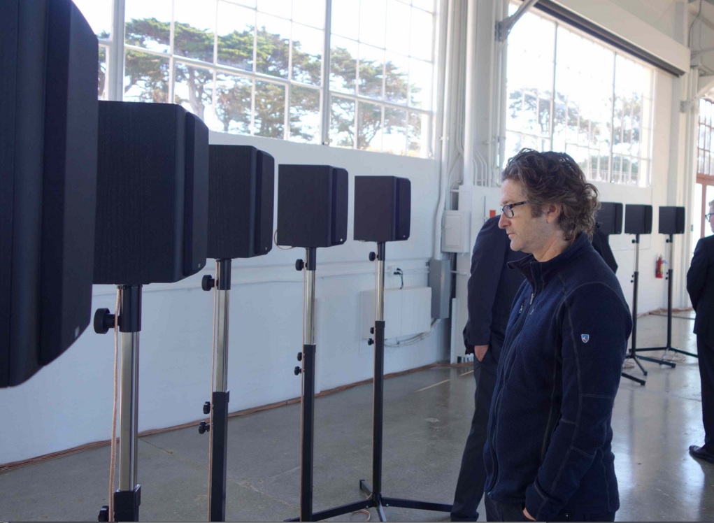 Janet Cardiff. The Forty Part Motet. 2001; installation view, Gallery 308, Fort Mason Center for Arts & Culture, 2015. Pictured: George Bures Miller. Courtesy of Art Hound. Photo: Geneva Anderson.