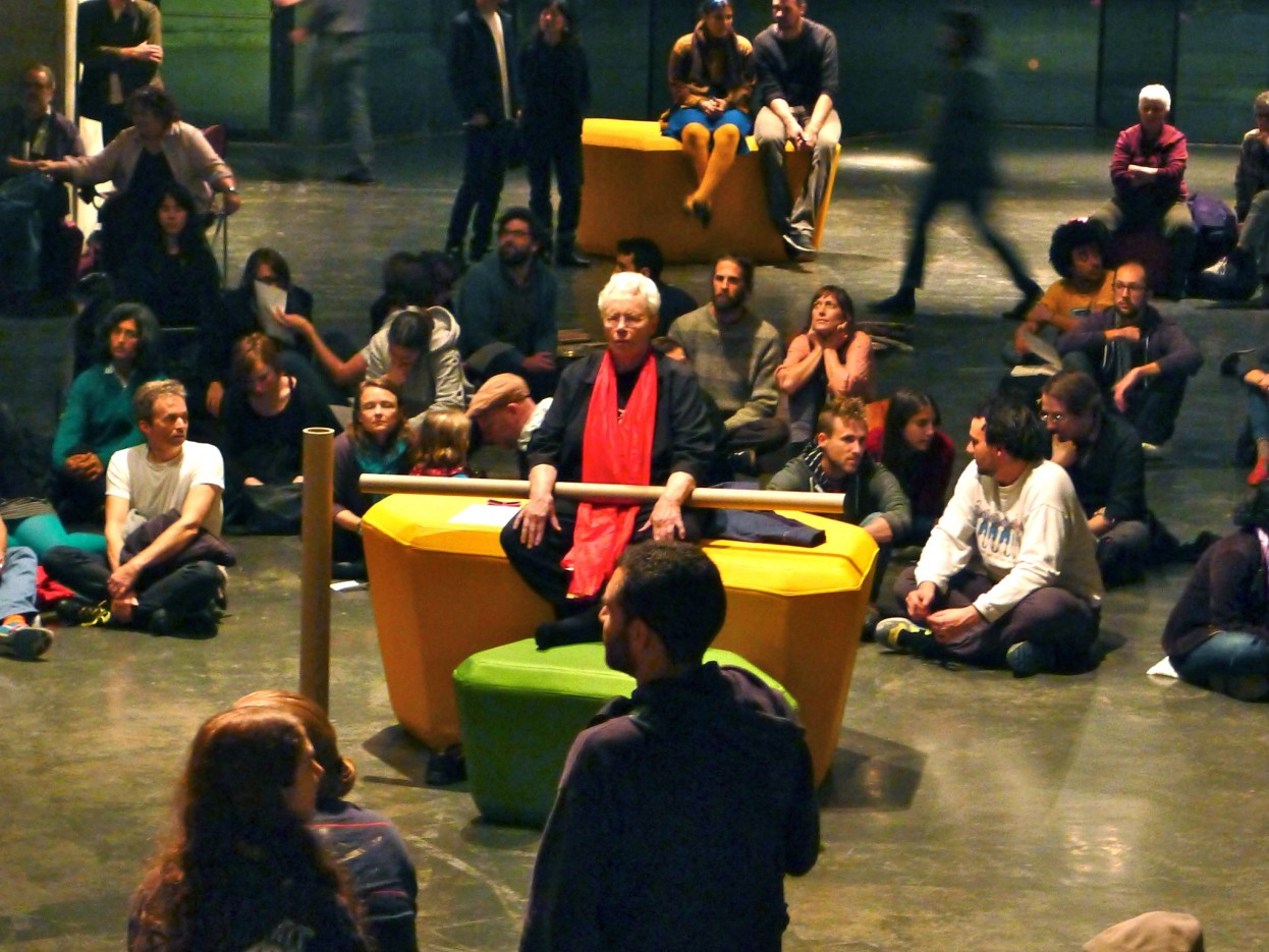 Pauline Oliveros performing with the Thingamajigs at the UC Berkeley Art Museum, November 21, 2014. Courtesy of the UC Berkeley Art Museum and Pacific Film Archive.