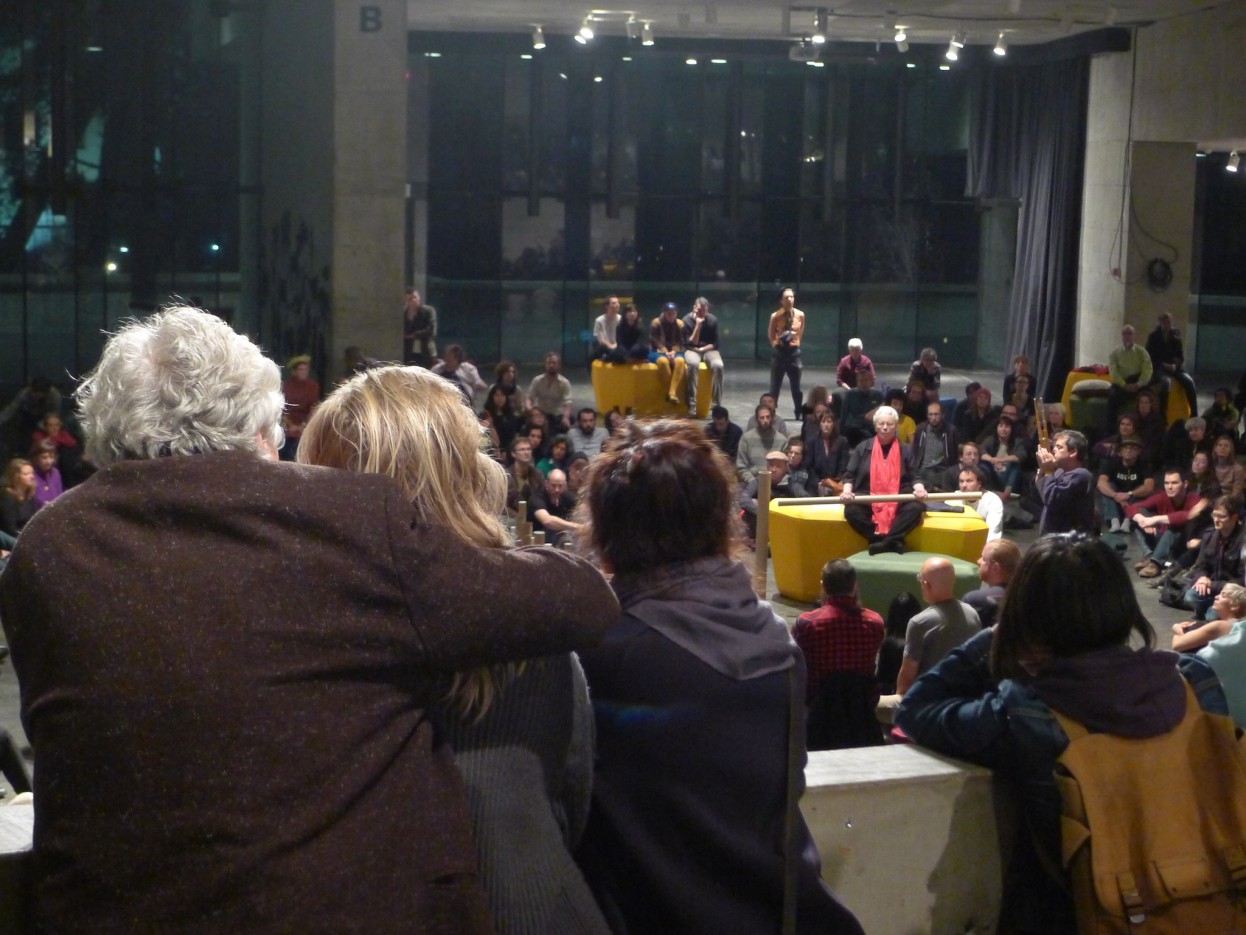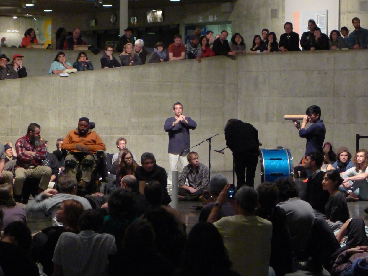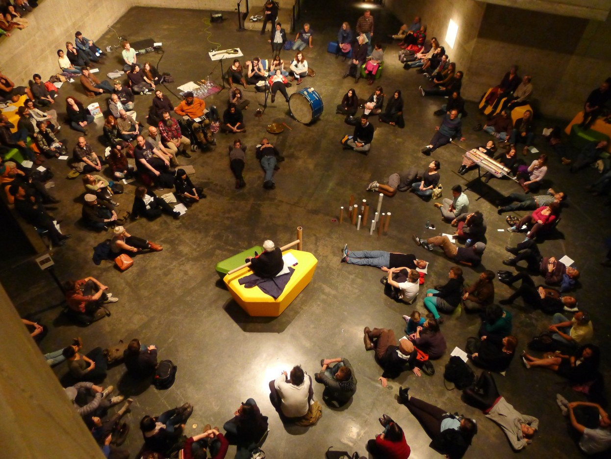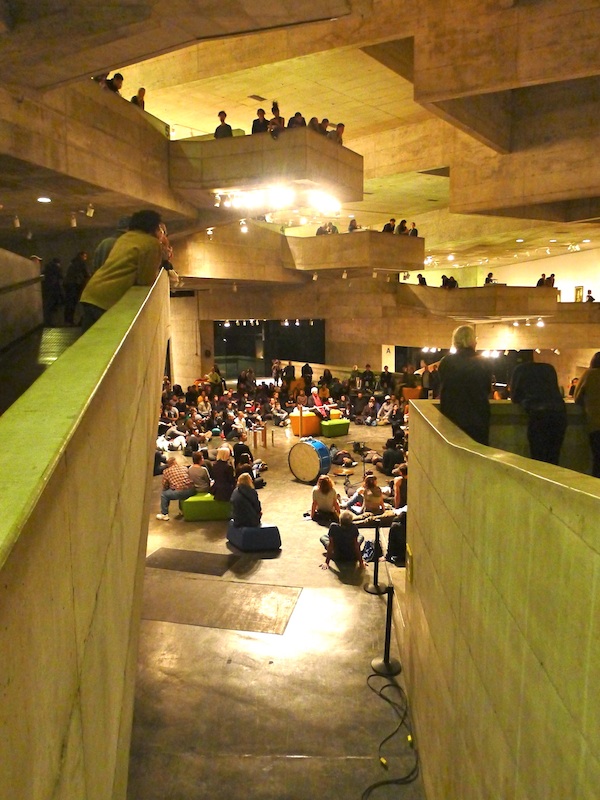 PM: I am so freaking ridiculously sentimental now every time I step into this space and think about the fact that this incarnation of the Berkeley Art Museum is about to end. The museum is vacating these premises because it was decided over a decade ago that all this cantilevered concrete apparently does not do well in an earthquake. As we’re getting closer and closer to that date of closure, the institution has loosened itself up and given itself over—at least the atrium—to people, to performers to act in it in ways that haven’t been imagined before. And so I really wanted to ask you about your impressions, your feelings, as you are about to perform in this space for the last time.