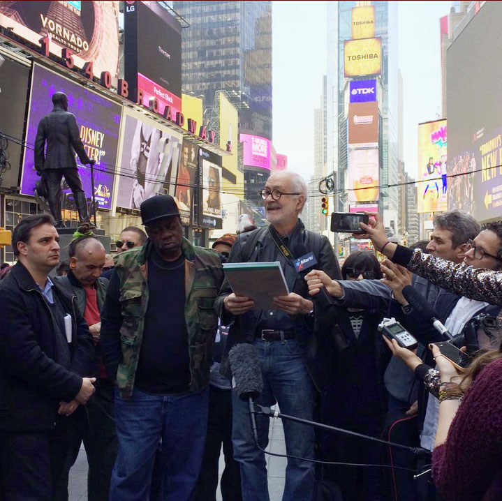 Hans Haacke is one of several artists who participated in #YoTambienExijo: A Restaging of Tatlin’s Whisper #6 hosted by Creative Time in Times Square in support of Bruguera on April 13, 2015.