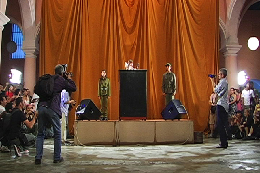 Tania Bruguera. Tatlin’s Whisper #6 (Havana Version), 2009 (performance still); installation with stage, podium, loudspeaker, video camera, microphones, and color video, with sound, 40:32.