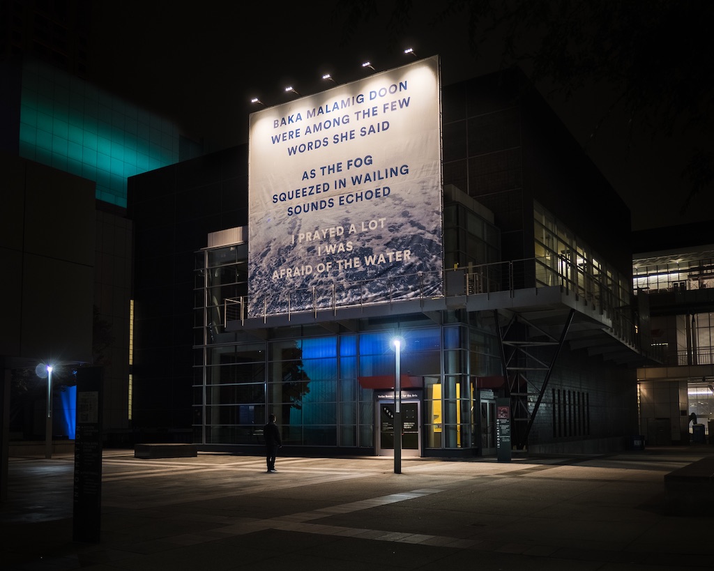The billboard—part found poem, part landscape—physically mimics the architecture of YBCA and looms large above the door below it. Despite its size, the billboard has a lightness of presence (in profile, it’s so thin it might disappear). The text is sourced from the writings and words of three Bay Area Filipino American icons from three generations: Jose Antonio Vargas (b. 1981), journalist, filmmaker, and immigrant rights advocate; Al Robles (1930–2009), poet and activist; and Victoria Manalo Draves (1924–2010), Olympic diver and gold medalist. In Reyes’s piece, their words are decontextualized and laid over a photograph taken by Reyes at San Francisco’s Ocean Beach.1 The thin, white vinyl of the billboard—printed with an image of a blue ocean, stretched over a metal armature, and hoisted above our heads—mimics the sail of an ocean vessel, rippling in the wind.