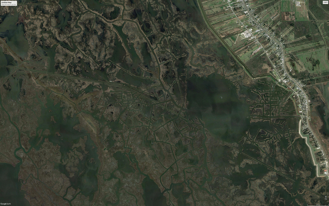 Oil access canals carve up the wetlands and lead to land loss in southeast Louisiana. Image courtesy Google Earth.
