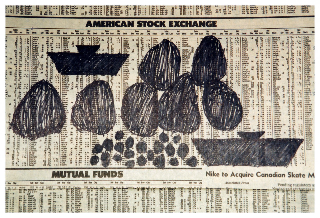 Brian D. Tripp. Balance of Payment, c. 1985; mixed media (marker on a page of the San Francisco Chronicle's financial section); 15 x 22 ¾ in. Courtesy of Libby Maynard. Photo: Libby Maynard.