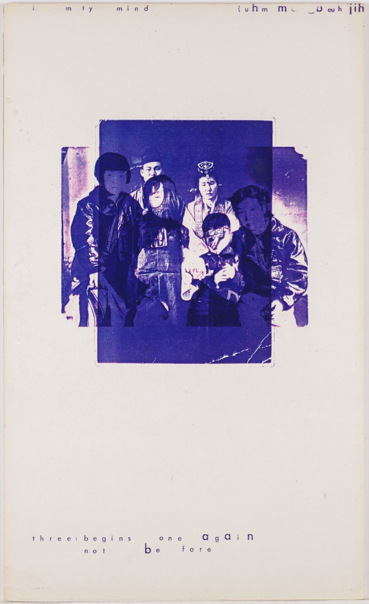 Crowding around all the works at Cha’s exhibition at the Berkeley Art Museum & Pacific Film Archive is the Cha family’s 1963 flight from post-coup Korea when Cha was 12 years old. Cha memorializes displacement in the eighteen panels of Chronology (1977). Each panel hosts color photocopies of family photographs and a typographically animated, concrete poetry caption such as: “three:begins one again not be fore” and “not be named knew heard. partache/ake.”10 Transcribed here, these lines fail to explain either their photographs or their typographical layout, but they reveal a kind of order that spirals toward linguistic and visual disorder, and a piling on of family relationships.