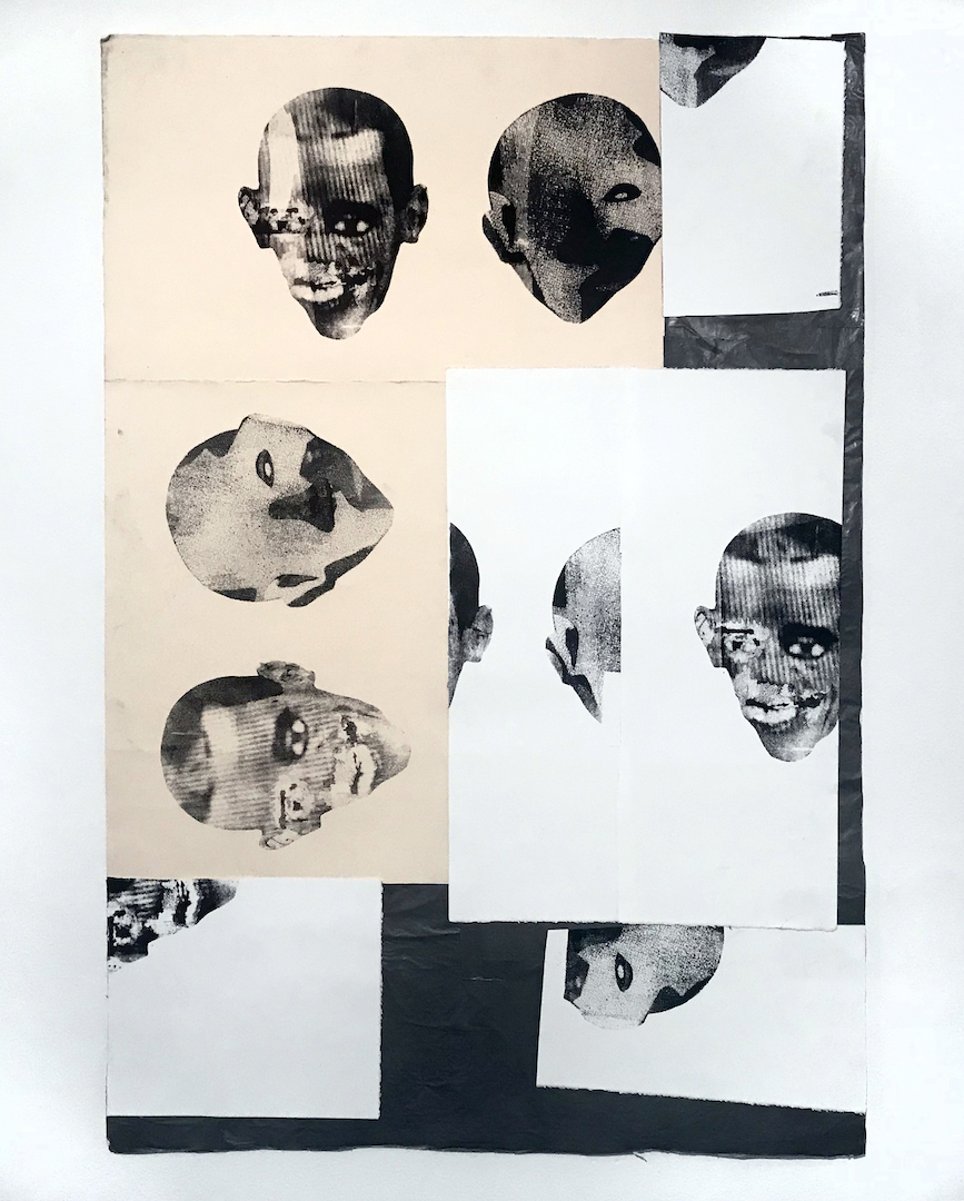 Many of the works on paper in Danny Giles’s Figura (2019), currently on view at SOIL in Seattle, begin with surveillance images of Obama-masked gunmen as source material. Through successive layers of printing, collage, scanning, digitally manipulating, and translating to silkscreen, the images become further degraded and transformed—thus exploring, according to the exhibition essay, “notions of mimicry and abstraction.” Another layer of costumed performance occurs in the titles, which bear names like James Davis and Louis Ortiz, comedians and impersonators known for their Obama impressions.