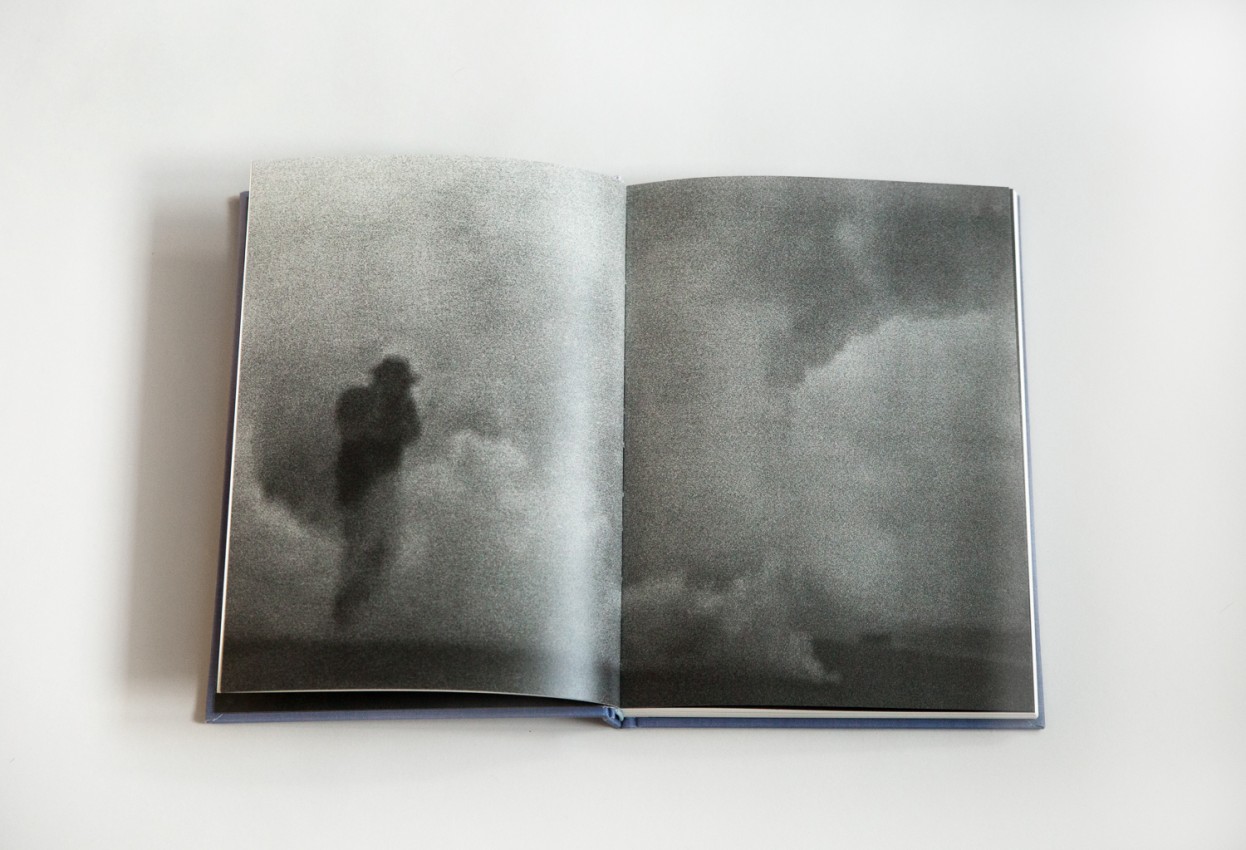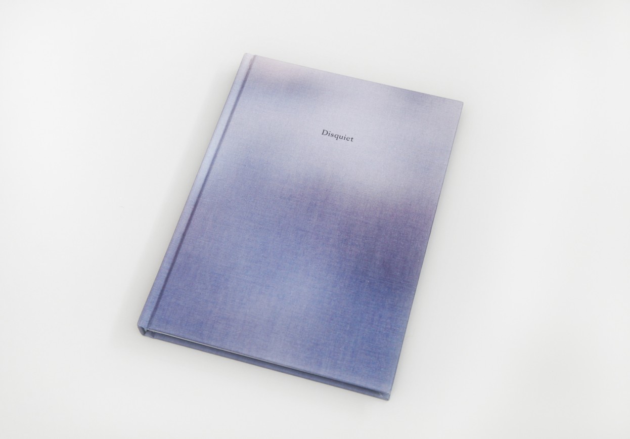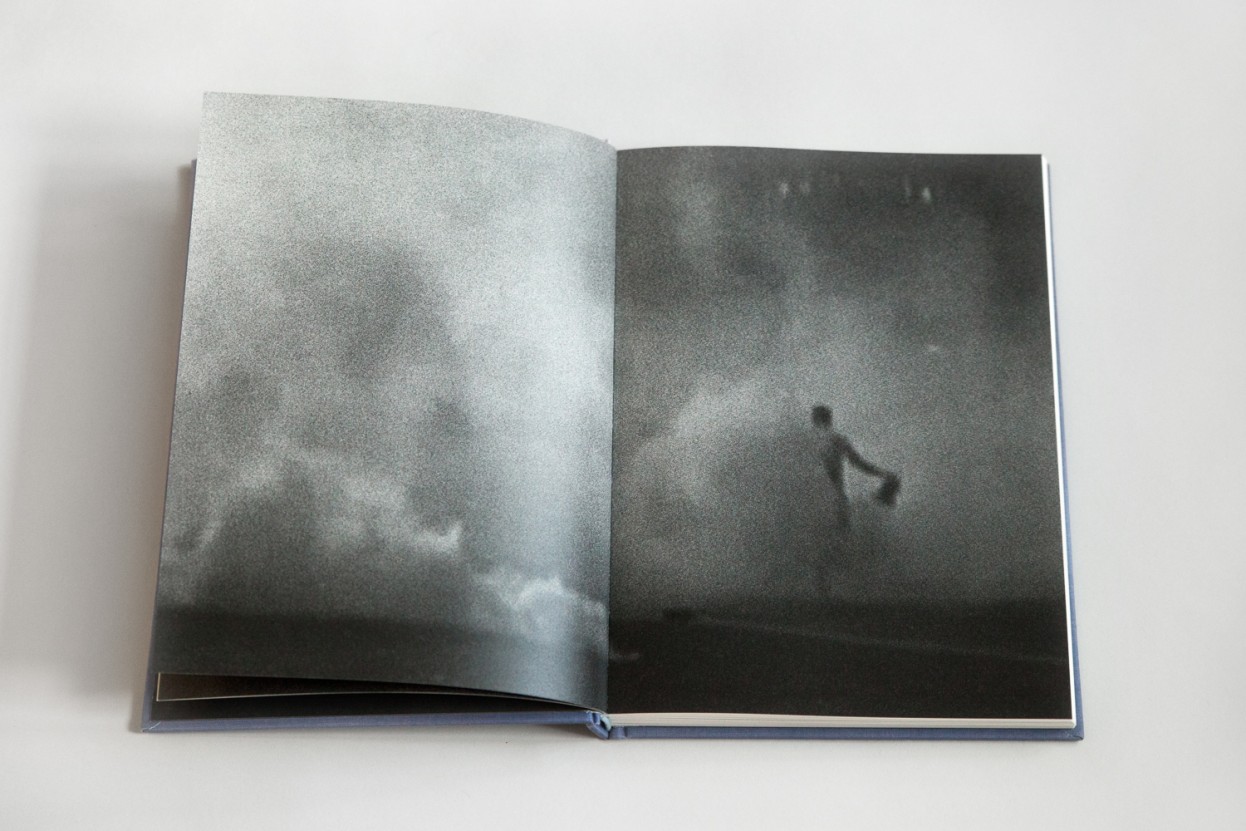 Disquiet begins with two full-bleed, double-paged, extremely grainy black-and-white photographs of a single individual surrounded by thick, cloudy plumes of smoke or fog. In the first image, OWS #1, a masculine figure holds his head in his hands as the surrounding atmosphere envelops him. In the second image, OWS #2, a smaller figure, barely visible, is in the process of running toward the viewer; the photograph’s slightly pulled-back point of view reveals a street full of smoke, caused by some event outside of the camera’s range. The following page is a photograph of a worn and wrinkled scrap of paper that reads