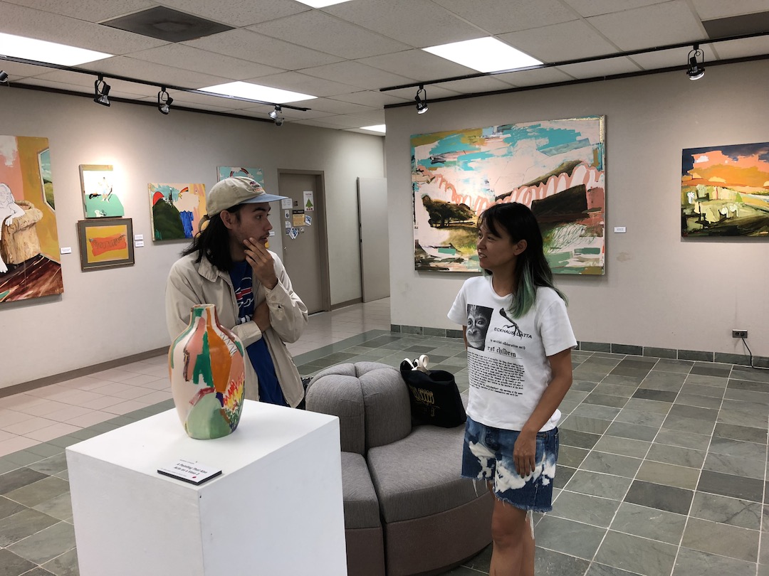 Amy Yao visits the exhibition Maybe Later: Kainoa Gruspe and Mark Yoshizumi (Sept. 17—Nov. 10, 2017) at the Hawai‘i’ Pacific University Art Gallery in November 2017. Courtesy of TRADES A.i.R. Photo: Don Felix Cervantes.