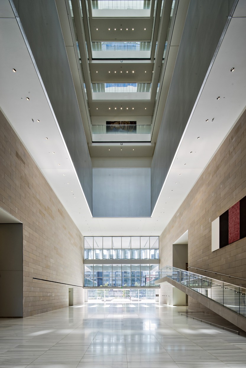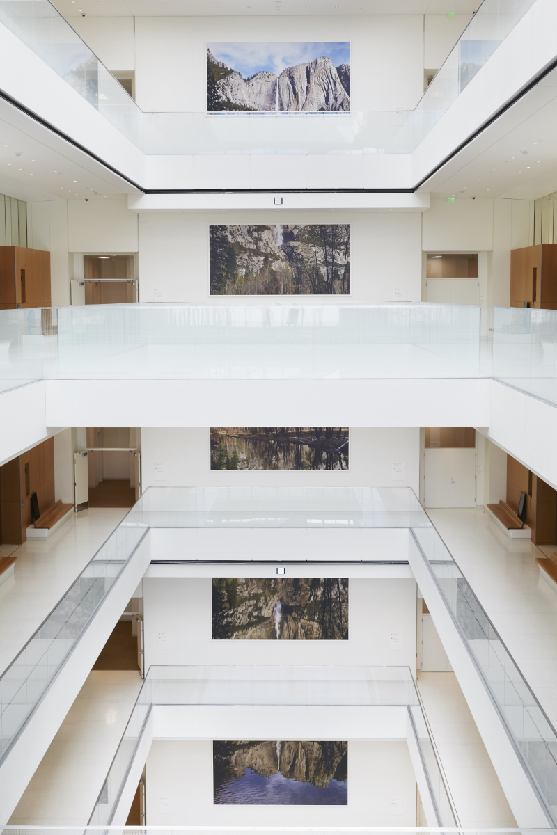 At the southern end of the lobby, Yosemite Falls (2016), a series of photographs by Catherine Opie, hangs across six levels of the building. A vertical, fragmented hexaptych of the waterfall in the Sierra Nevada mountains, the topmost photograph is simply the sky, followed by the crest of the waterfall, traveling down its expanse to the fifth floor where an image of the collecting water reflects the entire landmark.
