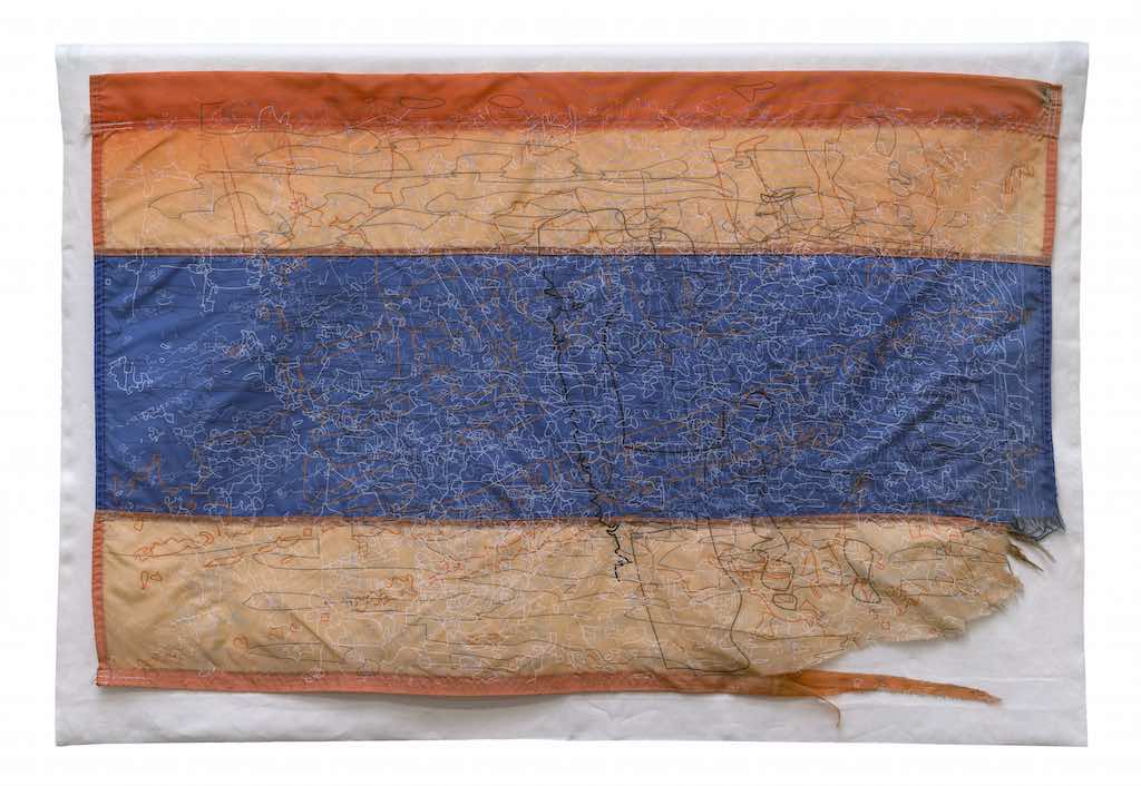 Political realities, like that of the U.S.-Mexico border, are the subject of Guillermo Gallindo’s prints on flags that once served as markers of water tanks for use by migrants crossing the border in the Calexico desert. In Siguiendo Los Pasos del Niño Perdido (Following the Steps of the Lost Child) (2017), crossing lines in various colors create an intricate network of traces. These traces suggest the steps of a lost child while also operating as a score for a musical composition, the kind the artist performed at the exhibition opening on March 23rd. Here, one encounters a relic from a politicized borderland, which documents migrants’ journeys from one country to another. Based on the intertwined paths printed on the map, the viewer is uncertain whether the child ever arrived.