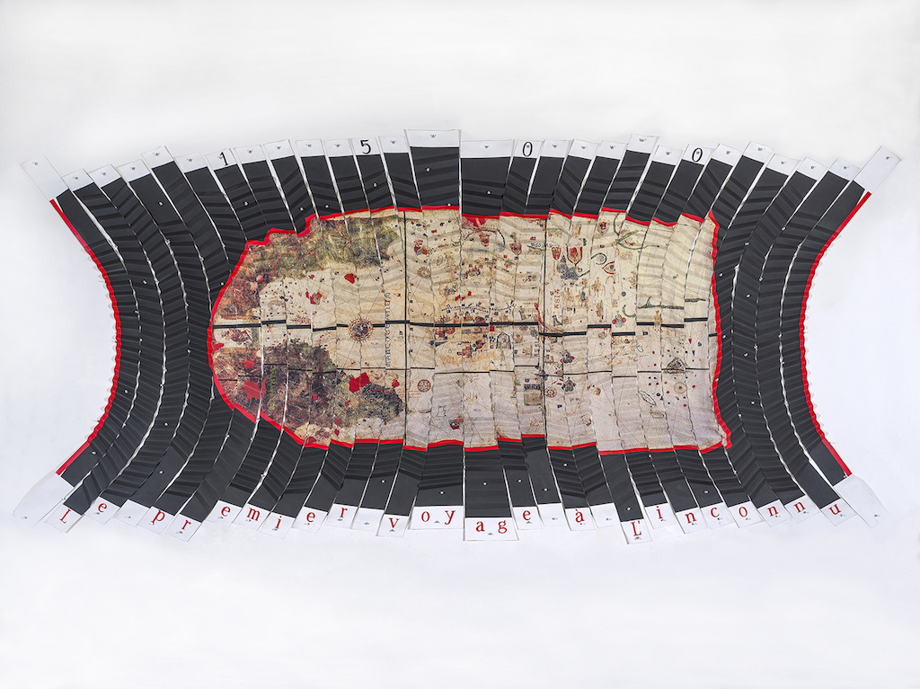 1992 was the 500th anniversary of Columbus’s voyage to the western hemisphere and Le Premier Voyage à L’inconnu is clearly a response to the commemorations of that anniversary; Rios literally re-presents the map that Columbus made as a result of this journey. A reproduction of the map has been printed on canvas, cut into vertical segments and pinned to the wall to create rippling visual effects. The result is a dynamic object, part print and part sculpture, that reinforces the notion that maps are subjective even if we take them to be the result of critical observation and scientific recording. Seeing the work from different angles, the central form of the map in the shape of a ship’s hull is visible, but the object shifts and changes as the viewer moves around it. This map features not only what was then previously unchartered territory, but a form of knowledge that was imposed upon populations inhabiting the islands of the Caribbean, as well as North and South America. While the map records a systematic effort to find useful information to bring back for Columbus’s sponsors, the King and Queen of Spain, it is also the transliteration of a series of encounters with land, sea, and people.