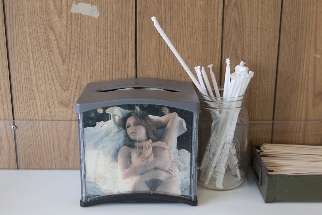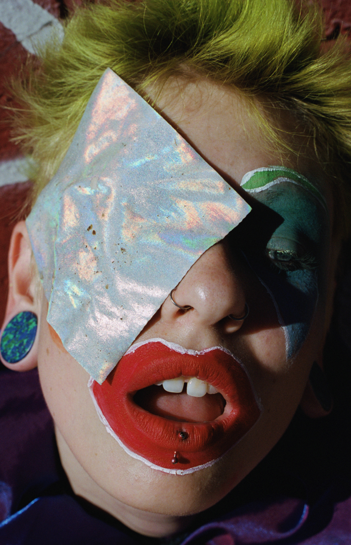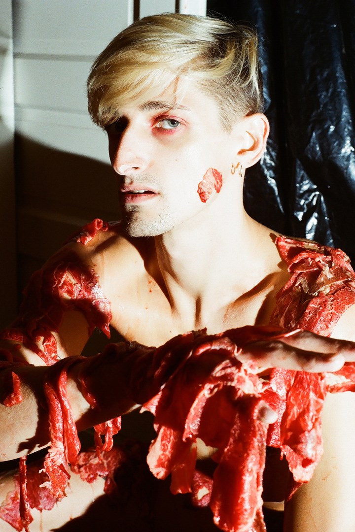The glossy and futuristic photos by Miss Prys exist simultaneously alongside the subdued and reverent corporeal landscapes by Jenny Olsen. Both are glamorous and visually representative of a body’s location relative to the space it occupies. Each is sexy and contemplative in its own respect. Some of the exhibition’s photographs, like the polaroids of Williejane Dent and the portraits by Krystyna Solodenko, shine in their sincerity, like outtakes from a project done among close friends. Photos shot by Jess Garten, Rachel Lily, and Danni Ordoñez are more overt and seductive. Unsettling and provocative, they’re designed to rattle and captivate the audience, much like the shot by Garten of a young individual posing, adorned with raw meat. Particularly with the work of Sevin Mundo, their juxtaposition of fake gore and real weapons is an anomaly in the show that toes the line of comfort in a more glaring manner.