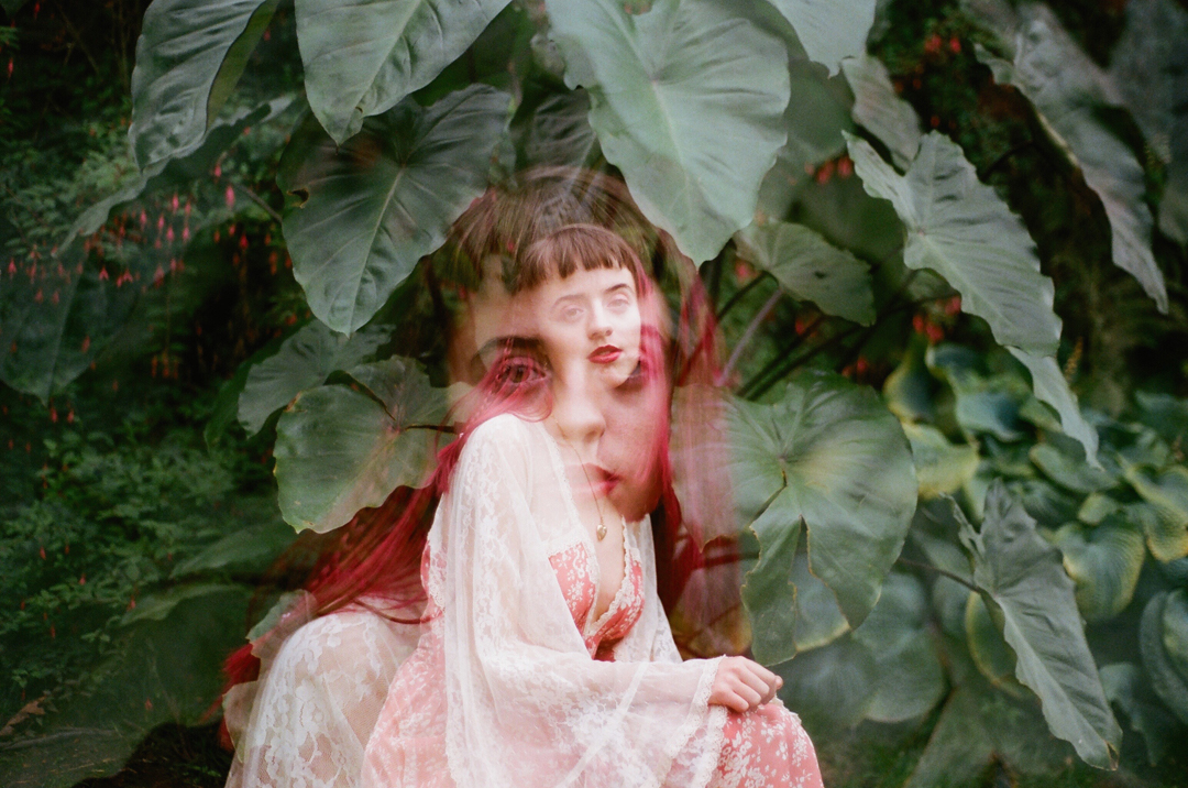 Highlighting both digital and film photography, Fantasies in Parallel is a striking, playful experiment in identity and presentation. The title aptly describes this show as fantastical; the photographs create their own alluring, brightly colored universe laden with mystery and intrigue. A strong sense of community and camaraderie is felt among these creatives. Acquainted with one another via the image-heavy culture of social media, their construction of an online support system now manifests in reality at Grapefruits. Further connoting the sense of collaboration and influence between these artists are strong thematic and visual parallels in their work. The entire exhibition presents as a friendly group show, filled to the brim with stimulating and overwhelming imagery. As visitors move through the space—encountering stoic portraiture, barren landscapes, and tantalizing boudoir-esque shots—they are meant to feel a sensory overload of emotion. One can expect to feel calmed by Sofija Olson’s campy scenes of beautiful bodies bathing, then fascinated by Haley Jensen’s spooky manipulation of reflective props, followed promptly by curiosity and perhaps unease at the sight of Yvette Aispuro’s model posing nude with a seemingly inordinate amount of baguettes.