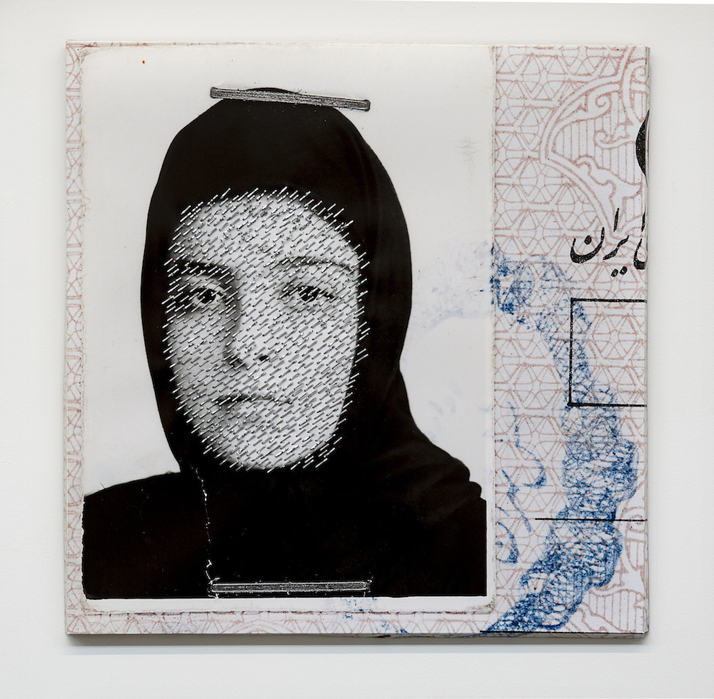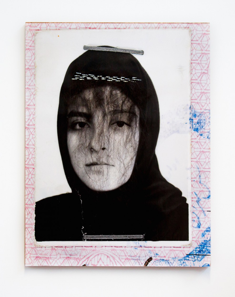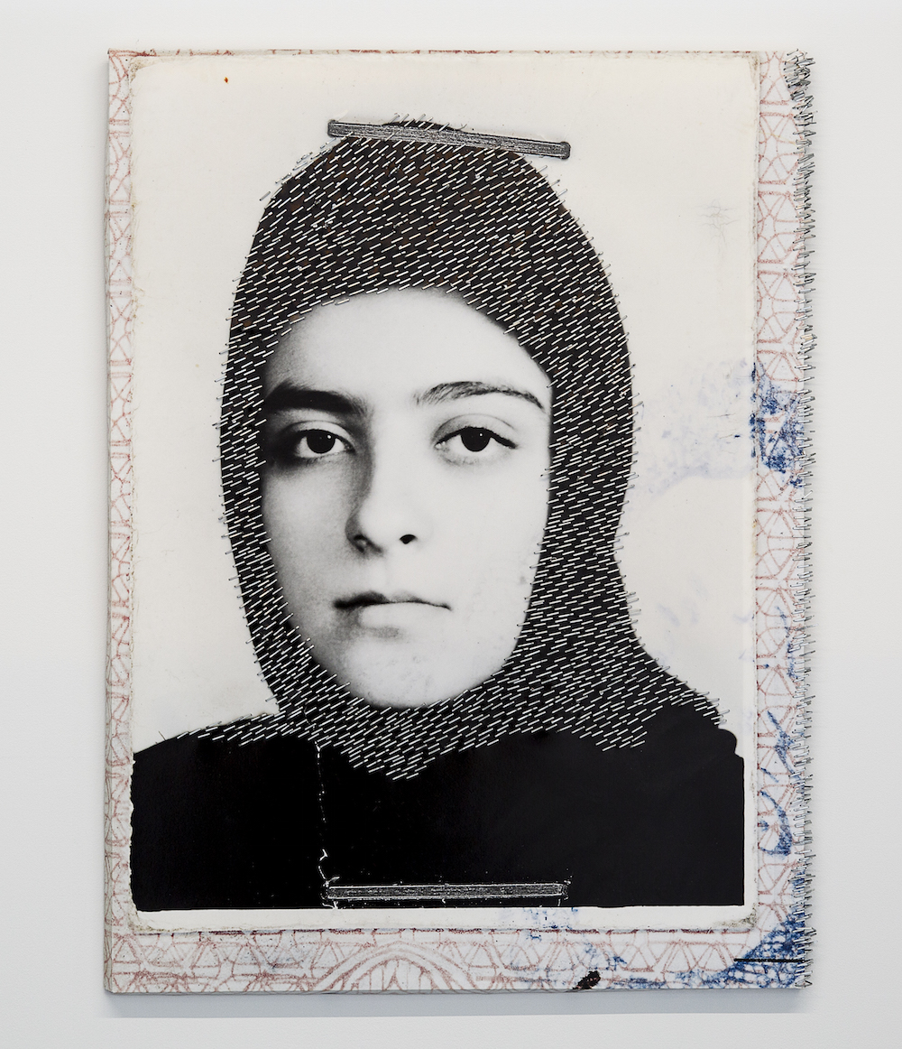 It is impossible to view Nasim Moghadam’s SelfHood series without feeling the tactility of a stapler. Moghadam pressed staples into scaled-up reproductions of her Iranian birth certificate. The main image repeats over the four works in the series: a black-and-white portrait of the artist at age sixteen wearing a black headscarf, stapled to the official Iranian state document; the teenage face carries a palpable intensity. In SelfHood I (2018), Moghadam’s most assertive and unabashed piece, the face is entirely covered in staples, with irregularities indicating the artist stapled the image by hand. Through the series, stapling becomes a paradoxical gesture, unfixing the self from its official proxy. SelfHood II (2018) fills the shape of the headscarf with staples, drawing attention to a staple applied across the forehead in the original photograph. This staple affixed to Moghadam transforms the staples affixed by Moghadam into gestures intended to undo what was demanded of and placed on the artist in her youth. These staples do not harm; rather, they mark the artist’s life through the more than two decades since the original photograph was taken. In contrast to the works by Woods and Pardo Ariza, Moghadam’s work is directly autobiographical and considers futurity in an image from the past: not what was but what is and will be.