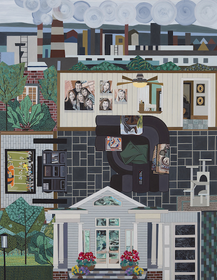 Ann Toebbe similarly offers viewers in-depth access to her domestic scenes. She primarily paints top-down views of houses with an aesthetic of early versions of “The Sims” video games: flat saturated colors, patterns, and minutiae, without rendering or cast shadows. Many of her compositions zoom in past the roof, so that a viewer peers into yard and house simultaneously. Depicting both interior and exterior spaces in the same picture is a classic move in the style of Piero della Francesca. But Toebbe presents multiple views in impossible concurrence, making the viewer omniscient. In Family Room (Sister) (2017), Toebbe details so much about the household—a family of five with three daughters and a cat, who like to watch the Cincinnati Bengals—that it’s like TMI. Toebbe's cataloging straddles intimacy and awkwardness; it’s less data breach than Facebook over-sharing. Social media has increased our tolerance for what is acceptably made public, which makes the exposure in Toebbe's paintings normative.