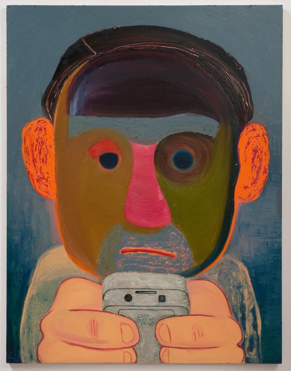 Nicole Eisenman is one of the most acerbic and funny contemporary painters. She has recurrently turned her brush to our obsession with gadgets. In Weeks on the Train (2015)Eisenman centers on a passenger ensconced in her laptop, her potbelly peeking out. This is the antisocial side of personal electronics, without eye contact, companionship, or human interaction. The comical, James Ensor-ish jesters in the row before the protagonist only emphasize her solitude. Eisenman paints a related picture in Breakup (2011), in which a canvas-filling face stares despondently into a phone. Notably, she does not reveal what her subjects see on their screens. This angle emphasizes the psychological impact of technology without showing viewers the actual message. In Selfie (2014), Eisenman paints a profile of a reclining Gustonian head gazing into his phone, which shines back his enlarged cartoon eye. Here, a viewer does see the screen, but it only acts as a mirror. Eisenman shows us an altogether-too-familiar reflection: individuals, lost and melancholy, left to their devices.