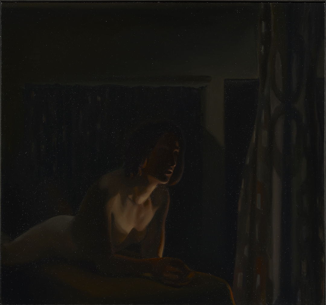 Native Angeleno Monica Majoli presents another take on reflected bodies. Her series Black Mirror, begun in 2009, shows shade-on-shade images of her nude exes, painted and drawn from staged photographs, which hang as diptychs with architectural, abstract lithographs. The series title alludes to the blackened mirrors with which a previous homeowner had lined the walls of Majoli’s bedroom—though for today’s viewers it will certainly conjure the eponymous Netflix show, which explores the dark underbelly of high-tech near-futures. The paintings are intimate in scale, in subject, and in pictorial composition. Majoli pushes the viewer into the personal space of the women. In Black Mirror (Judie) (2012), for example, we can almost feel Judie’s breath emanating from her spot-lit lips as she lies naked in noir darkness. In Black Mirror (Pamela) (2012), the subject lounges in a suggestively post-coital repose. Majoli’s paintings are uncomfortably revealing and confrontationally personal. They are like John and Yoko giving interviews from bed, letting virtual strangers into private lives. In the revisionist interpretation in which the phrase black mirror means a screen of a shut-down device, the viewer of these paintings is the cellphone left on the nightstand, given entre into a bedroom that should be off limits.