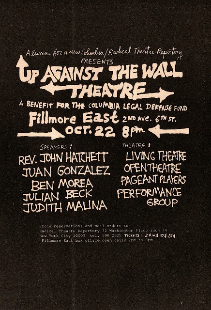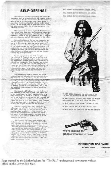 ES: At this time, you joined the Motherfuckers, which grew out of Black Mask and was formed by Ben Morea and Dan Georgakas. The Motherfuckers participated in the students' strike at Columbia University, helping to occupy the math building, and were responsible for organizing the Garbage for Garbage protest, in which you dumped uncollected refuse from the trash strike into the fountain at Lincoln Center and called it an equitable exchange for the kind of culture that they were providing. The group is also infamous for hurling cow’s blood at Dean Rusk, the Secretary of State, during a foreign policy association banquet and for Occupy the Fillmore East after negotiations for a free community night failed. But the Motherfuckers also created a real community for people who were at loose ends. You ran free stores and crash pads and held community feasts. You also had a neighborhood watch that stood up against police harassment.