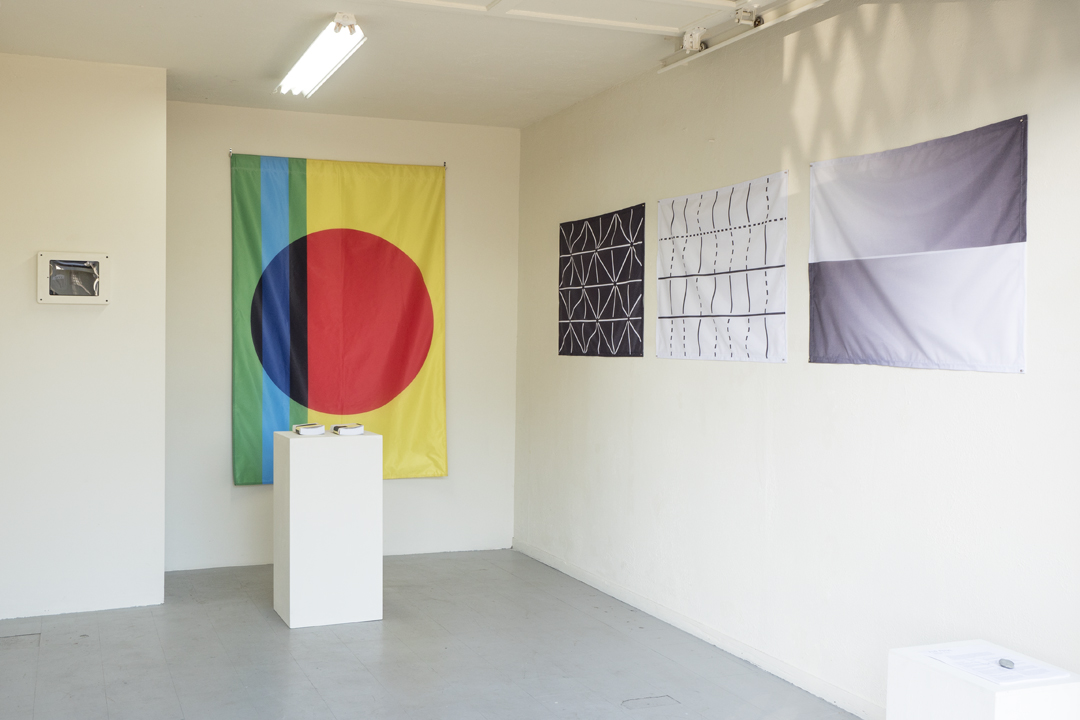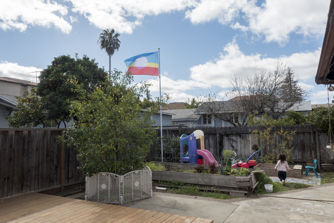 In the last project, Chris Hamamoto and Jon Sueda—both graphic designers—created an algorithm that generates flags. They made a flag for Hanna based on where she has lived or visited in her life. She was born in Japan and has been to three or four cities. For the opening, they hoisted it in the backyard—Hanna’s flag.