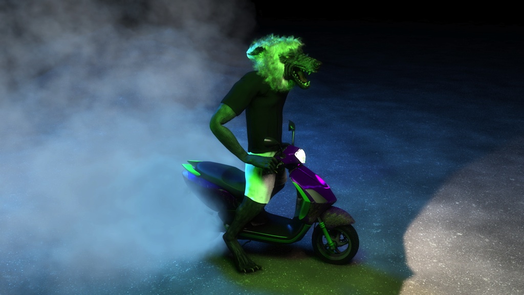 Bad at Sports contributors Brian Andrews and Patricia Maloney sat down with artist Takeshi Murata and sound designer Robert Beatty on November 9, 2013, at Ratio 3 in San Francisco, to discuss Murata’s most recent digitally animated video, OM Rider (2013). OM Rider follows two animated creatures—a wizened old man that Andrews describes as “half the Curious George Man in the Yellow Suit, half like the butler from Rocky Horror Picture Show,” and a hipster wolf, which rides a moped through a barren landscape and performs other aimless tasks. The video begins with the creature playing a synthesizer that gives the video its title. OM Rider contains Murata’s characteristic absurd humor and aesthetic, which mixes highly attuned lighting and composition with more retro modeling and minimalist, almost antiseptic spaces. The conversation begins with a question about the creation of the video.