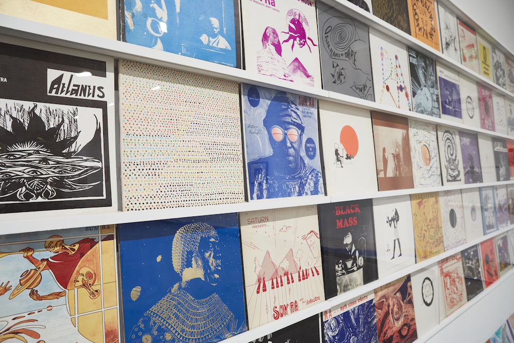Tucked into the darkest corner is a listening aisle made of spare black walls, punctuated by original album-cover designs, black-and-white photos of the Arkestra, and several earphones looping sound compositions from various time periods. There is a certain amount of intimacy required to fully engage a Sun Ra musical arrangement that cannot be attained in an institutional space, regardless of how dark the walls are painted. Sun Ra’s ventures, ranging from pedagogy and graphic design to science and music, were focused sharply on lines of inquiry, an often highly personalized journey that pulled from a variety of mediums and cultures. These wanderings were not designed for mass consumption or mainstream palatability, and to place them within spaces that subsist on these things compresses their very form and embodiment.