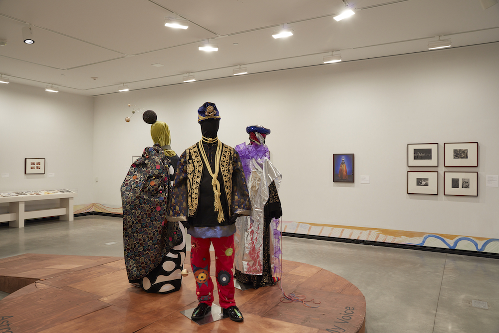 At the gallery’s center is a reimagining of Sun Ra Arkestra attire designed by Britt Howard of Portland Garment Factory. I find myself circling the three ensembles (at once a stunning collision of metallics, sequins, transparencies, and textures) repeatedly, trying to decipher each symbol. The vinyl text on the baseboard reads as a lullaby: “Astro Black American the Universe Is In My Voice.” The purple pyramids and dangling planets appear as a hyper-personalized iconography that would come to exemplify the artist’s work on site.
