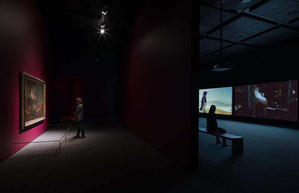It is an ambitious film, perhaps necessarily so. The transatlantic slave trade, whaling industry, “disappearances” during the Argentine “Dirty War” (1974–1983), and tragic deaths of migrants out at sea are but a sampling of the narratives singing in Akomfrah’s soaring chorus. At Akomfrah’s request, Vertigo Sea productively shares the SFMOMA exhibition space with J.M.W. Turner’s painting The Deluge (1805)—a depiction of the Biblical flood—whose wild chiaroscuros remind viewers of the myths surrounding the sea, as well as its mythmaking character. It is this mythic voice that Akomfrah’s piece embodies and reimagines in order to open new audiovisual ontologies.