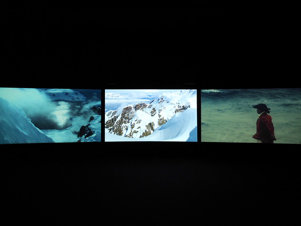 Each time I watched Vertigo Sea, I was struck by Akomfrah’s collage of different representations of the sea, particularly the stylistic differences within these representations. Staged scenes of actors in colonial costume looking out to sea are juxtaposed against National Geographic-esque images of aquatic landscapes and marine life. These glossy tableaus are then complicated by archival footage of a different tenor, such as grainy vintage clips of polar bear hunts and what I presume are scenes from older films about the slave trade. The archival imagery packs several hefty emotional punches, but I am more troubled, and therefore more intrigued, by the glossy cinematic visuals. Over and over again in my notes I wrote, “What is the meaning of the cinematic, or sublime spectacular, here?” How is beautiful imagery of ecological and humanitarian disaster used responsibly, without allowing aesthetics to distance us from the peril that we can see only through a camera lens, thousands of miles away?