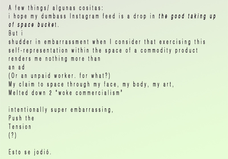 Despite its merits as a democratizing platform, the internet has always reflected the hegemonic and hetero-normative tendencies of its participants. Social media in particular has a track record of oiling the machine with the sweat of marginalized communities, from tone-deaf body-positive campaigns and the rampant use of AAVE (African American Vernacular English) as a marketing tactic to the subtler complexities of POC communities repackaging and monetizing their own aesthetics. Wary as she is of these dangers, Córdova sees the potential for her and other artists’ online presences to contribute to the “good taking up of space bucket” by embracing alternatives to institutional visibility. For artists who have been historically excluded from institutions, the power to be a subject, even of a selfie, is profound.
