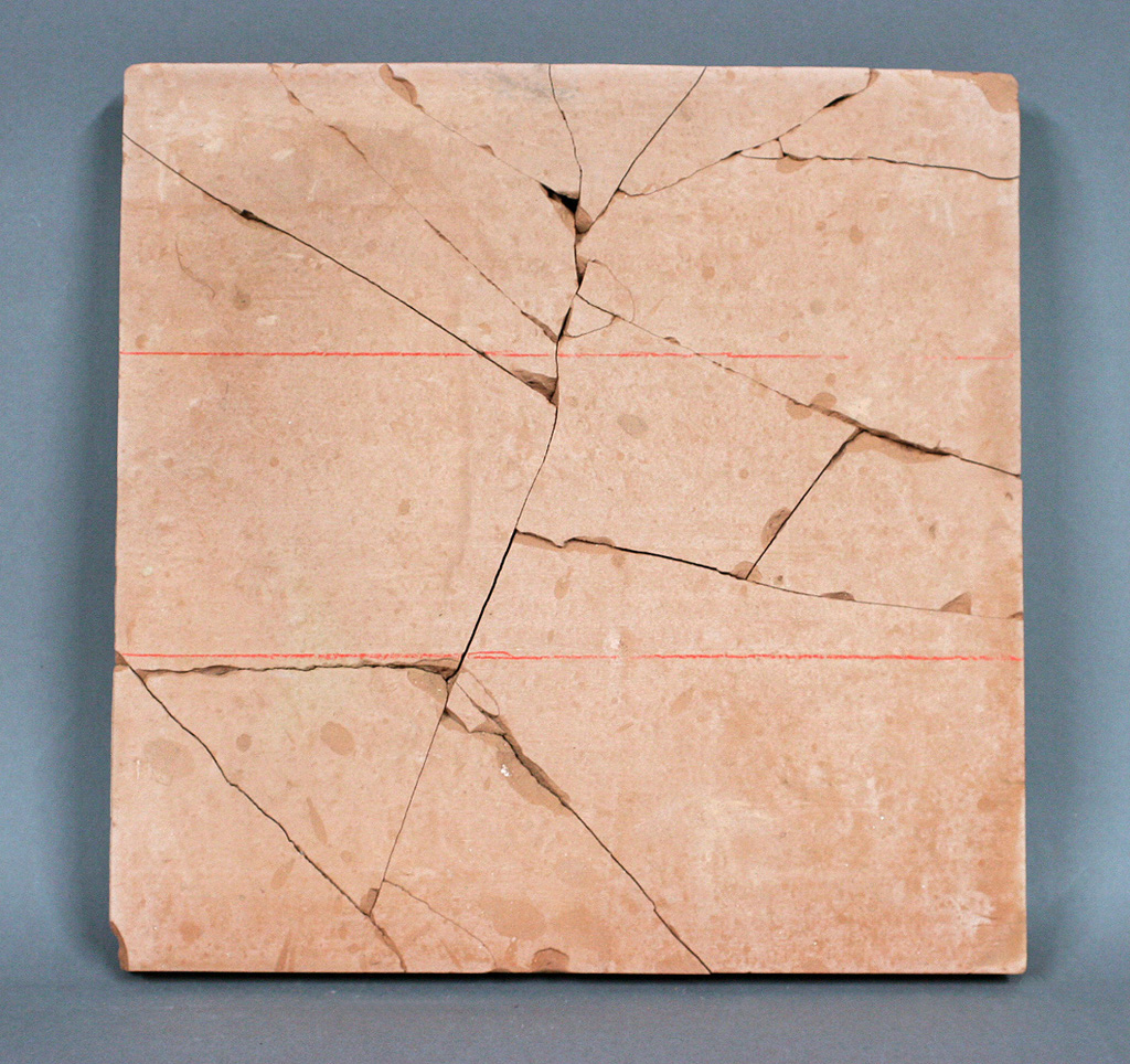 In Lunar (Phoenix II Series) (2003), for example, deep cobalt glaze approaches but does not trespass over the cracks that fan across its surface like palm lines. All of its power lies in the tension between the pools of blue and the white edges outlining the fissures. Conversely, Ecco (1994) is a single, unglazed clay tile that bears witness to the blunt force that shattered it. There are gaps where the fragments come together, and small pieces that have gone missing; they suggest that this object should not hold together. But two red chalk lines drawn parallel across its surface propose that cohesion lies not with physical integrity, but rather as part of a continuum of time or place that extends before and beyond the object itself.