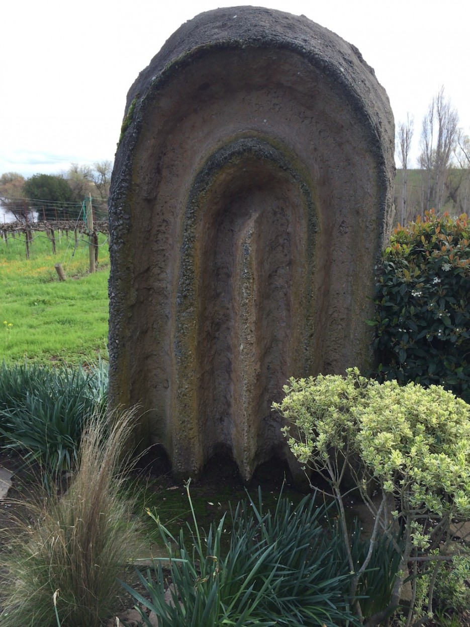 The cast side has deep grooves that rise, turn, and descend. They repeated the pattern of the plowed vineyards across the road. Now of course, the field is full of grown vines so you no longer see the rhyme. My grooves nevertheless let you know how that land once looked. Things get recorded in concrete.8