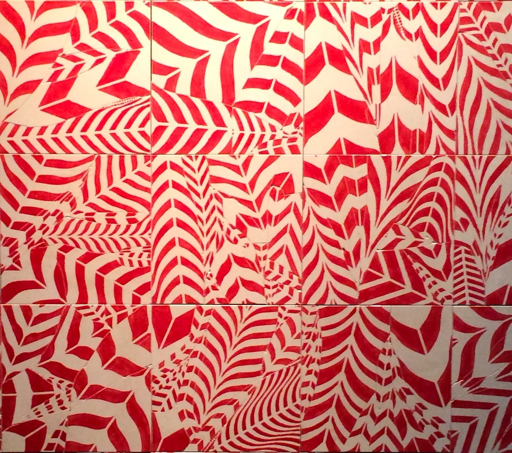 It begins with breaking and glazing more porcelain tiles than would be needed. Once that’s done, the search begins for two tiles whose patterns of breaks and marking attract and activate one another when paired. The pairs must be found that excite one another when juxtaposed. Within weeks an entire field coalesces into an image. The red version came together at a height of 9 feet, 2 inches, its width 7 feet, 10 inches.5