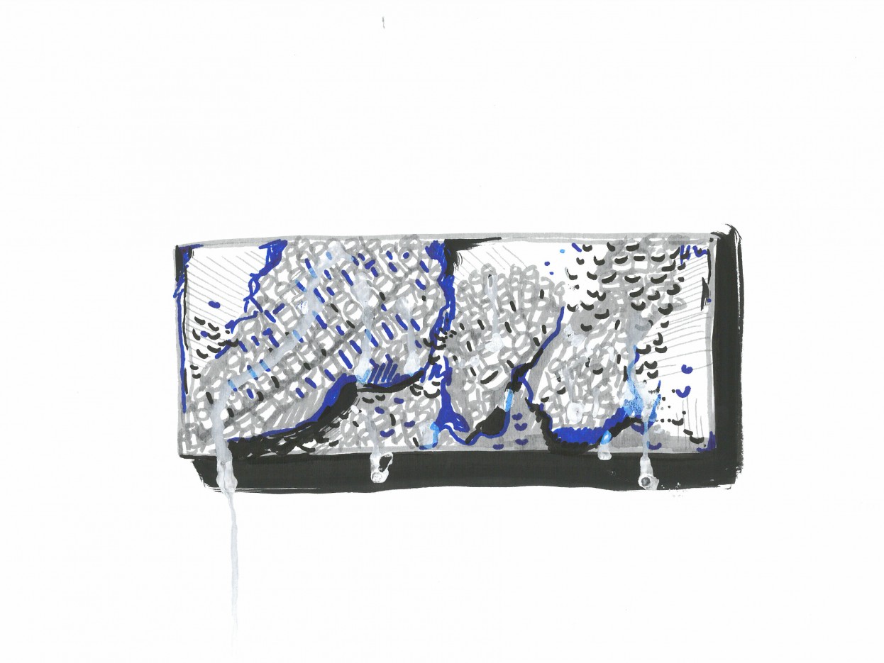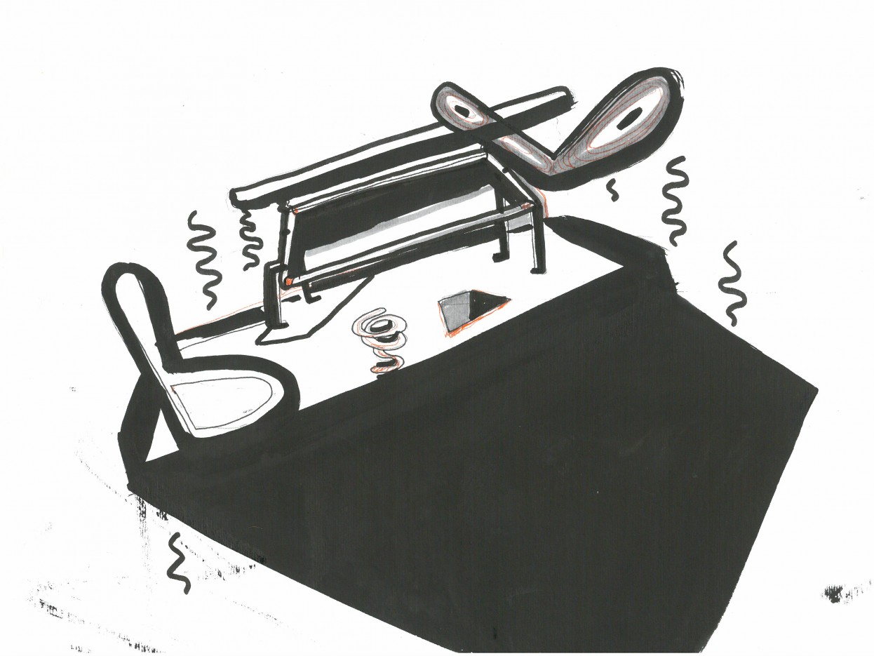 Because of this process, Carolyn’s first impressions of the five pieces are completely secondhand, mediated through our experiences on that afternoon in September. They demonstrate a form of storytelling and illustration, a twist on the Surrealist game of exquisite corpse. We sat across the room from Carolyn so as to not contaminate our descriptions or influence her drawings with our facial expressions. What follows are five blind drawing exercises and the illustrated results of our session with Carolyn. Feel free to engage in your own remote-viewing experiment by reading our descriptions aloud to someone else.