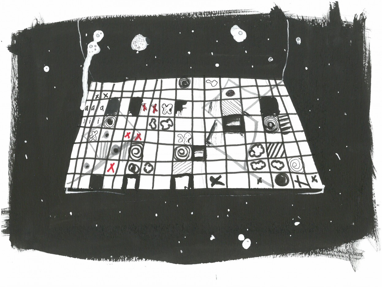Picture a horizontally oriented rectangle, eleven tiles tall and twenty-two wide. The tiles are white squares, most of them are painted with a different graphic image (though precisely forty-six are blank). Using brown, green, blue, yellow, indigo, red, pink, gray, and black, you’ll decorate the squares with simple symbols. They form a language of sorts.