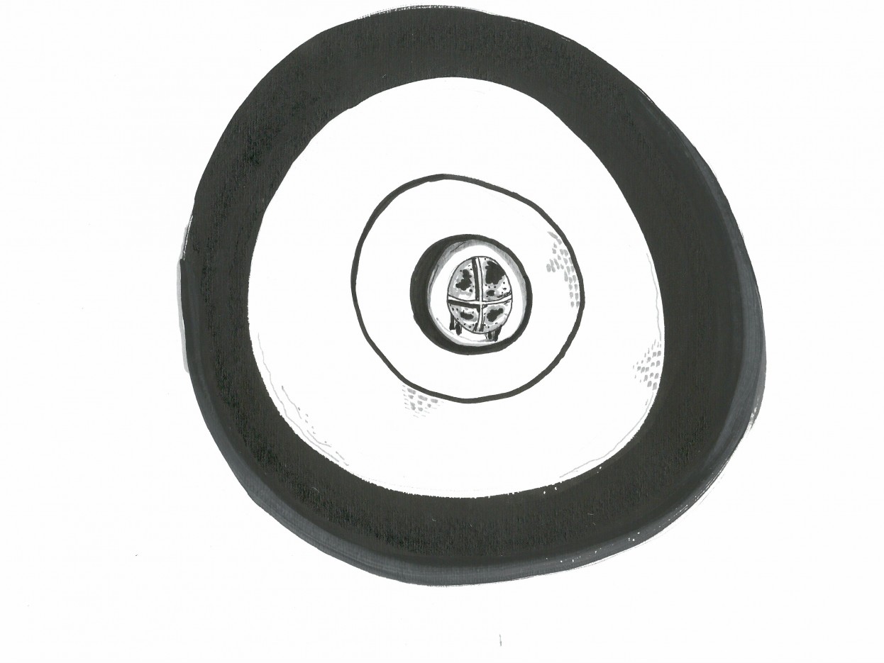 Draw a circle. Centered within it, draw another circle about half its size. And again, draw a third circle half that. The third circle is a hole, a view into the inside of a glass sphere. The sphere’s framework is thin metal and resembles the lines of a globe: latitude and longitude. The sphere sits off the ground on six legs that connect it to a cement donut of equal diameter below. The entire structure is dappled in the light that passes through the oak trees above it. Some of those trees’ leaves rest on the sphere’s surface, where dust and dirt cloud the glass inside and out.