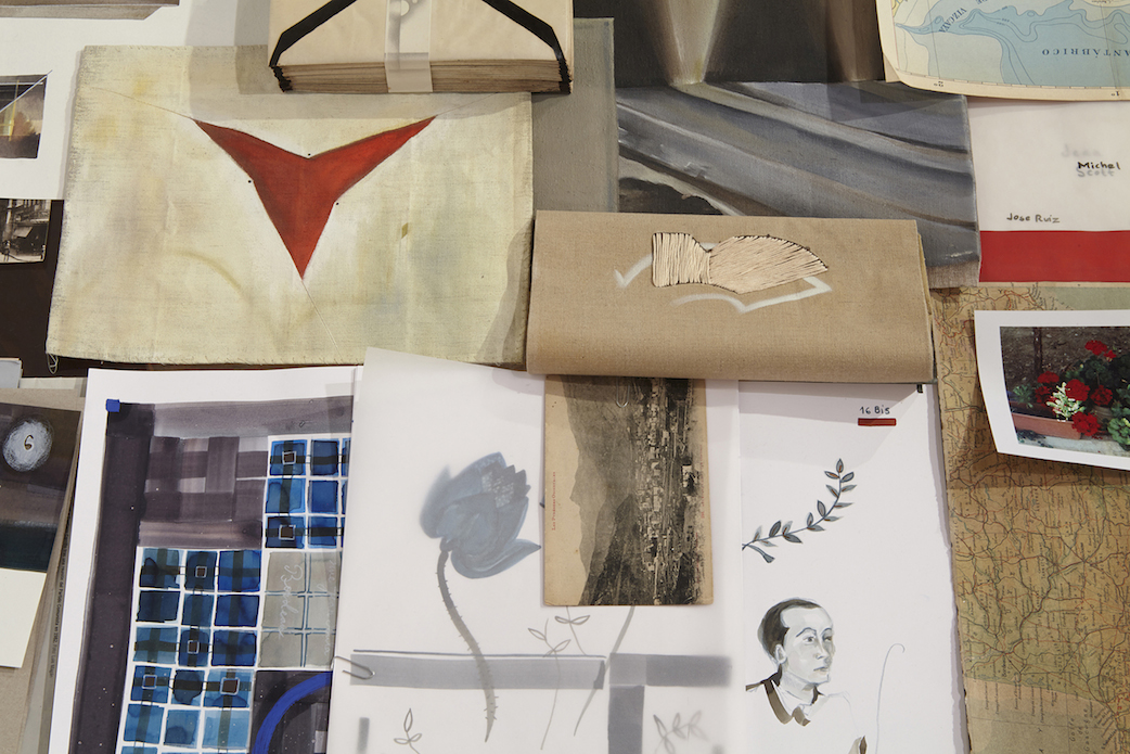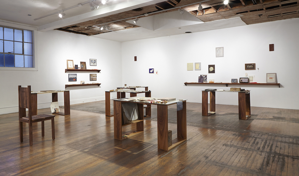 Patricia Fernandez. Points of Departure: Five Walks, 2012–15 (detail); glass and hand-carved walnut tables with drawings, paintings, watercolors, and text transcripts; each table 37 x 29 x 49 in. Commonwealth & Council, Los Angeles. Courtesy of the Artist and Commonwealth & Council. Photo: Heather Rasmussen. The transcripts are of a previously unwritten archive that records the path of the exiles from Spain into France after the Spanish Civil War.