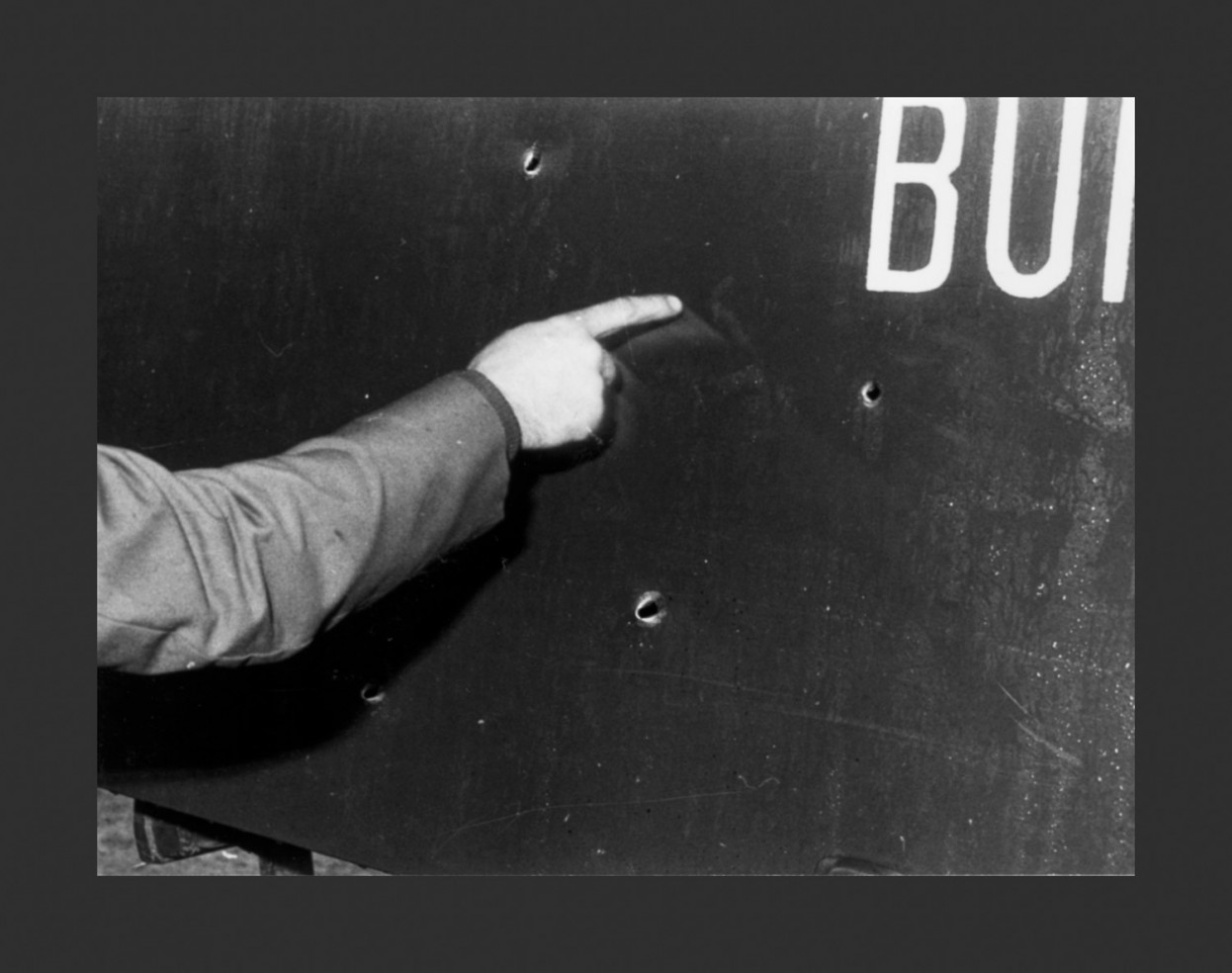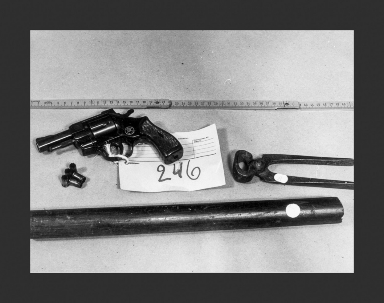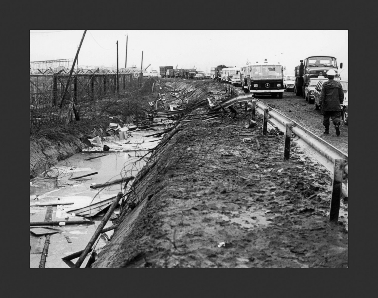 Once the office space is left behind, a mix of giant, brightly colored metallic containers, pipes, and other mechanical devices create the landscape where the heat produced by the fission reactions is converted into electrical energy. Then, when we enter the underground tunnels used to transport the nuclear waste, we enter another world. Almost entirely monochromatic, save a few splashes of colored lights or wiring, the tunnels act as an all-too-apt metaphor for the industry’s mentality surrounding nuclear waste disposal: out of sight, out of mind. Lastly, we travel through the eerie and atmospheric interior walls of the cooling towers. Tall, thin columns sweat in a fog so thick we can only see maybe twenty feet ahead, as if in a sci-fi dystopian dream. And once again, we are in the past—Danner uses evidentiary photographs from the police archive to bookend the narrative with an unapologetic series of images documenting the violent result of the protests: smashed car windows, bullet holes in a wall, the side of a road littered with detritus from the chaos, concluding with a series of evidence photographs.