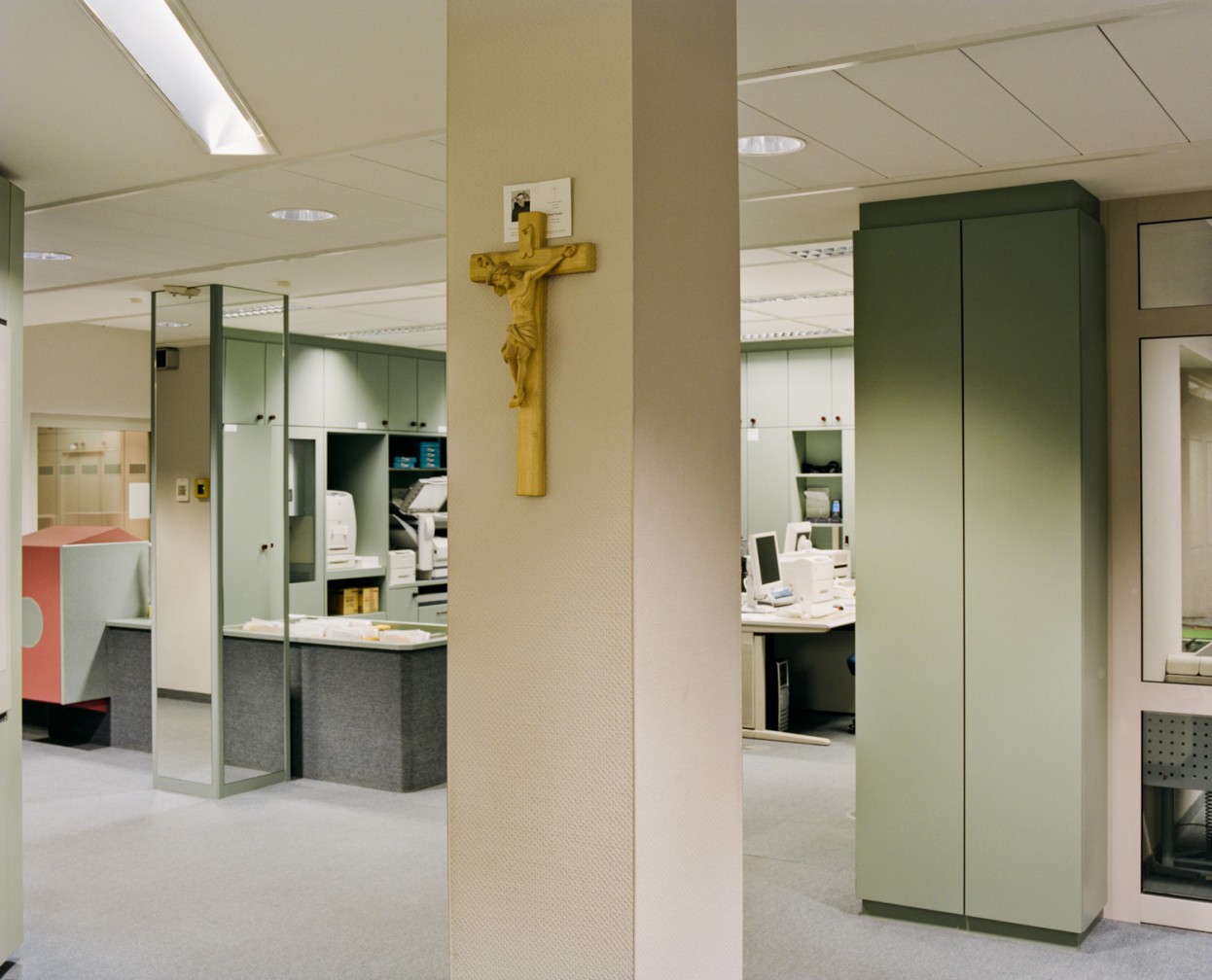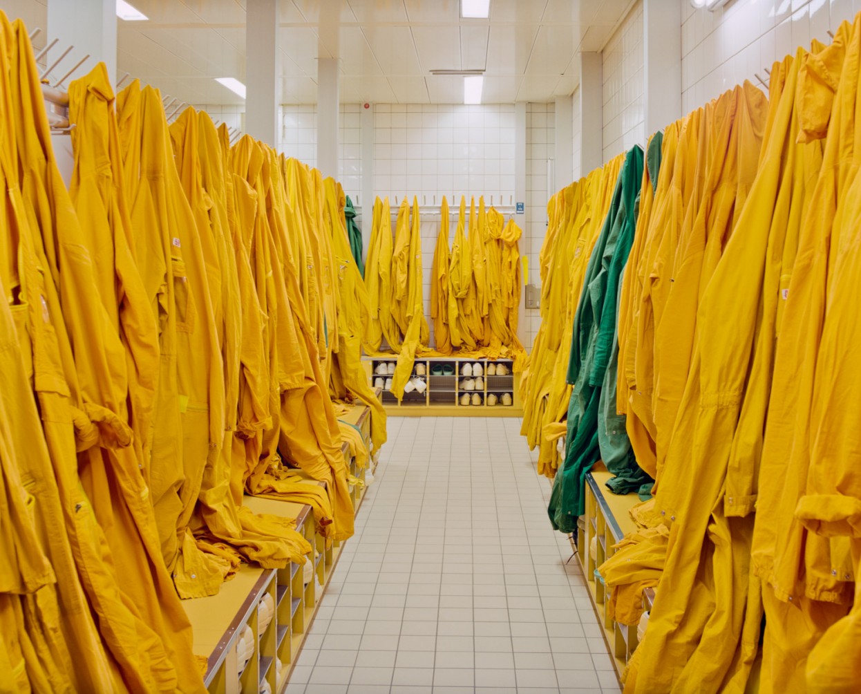 Through the seventeen nuclear-power sites in Germany he visited, Danner illustrates an expanded view of places typically inaccessible to the general public. In addition to the plants’ massive size and consequently large workforce, the general homogeneity of the interiors builds to a claustrophobic banality. Images of rows upon rows of keys, numbered lockboxes, temperature gauges, empty cubbies, and workers’ helmets allude to just how many people work at the plants. In their absence, however, Danner provides an ominous view into the evidence of the workers’ experiences. He methodically guides us through categories of interiors, utilizing repetition to amplify the impact of the various elements; the exposition is not subtle. Upon first entering the plants, we encounter a variety of security turnstiles and checkpoints, setting a tone of solemnity. Next we see lines of full-body uniforms hanging from hooks, ready to erase any distinguishing identity from the bodies that fill them. Bins labeled “used towels,” “contaminated shoes,” and “contaminated overalls” suggest the hazards faced by the workers, a suggestion drastically amplified by a sign tucked in a corner above a strange yellow hatch on the floor. The sign has an arrow pointing to the hatch and reads “Emergency Exit.” A series of medical rooms enhance the omnipresent sense of danger: a CPR practice dummy lies on the floor; a body scanner looms over an exam bed while a small photograph of a nude woman lying outstretched on a sun-bleached beach hangs on the wall; a shelf is stacked with multiple copies of binders labeled “Emergency Handbook” in parts I, II, and III.