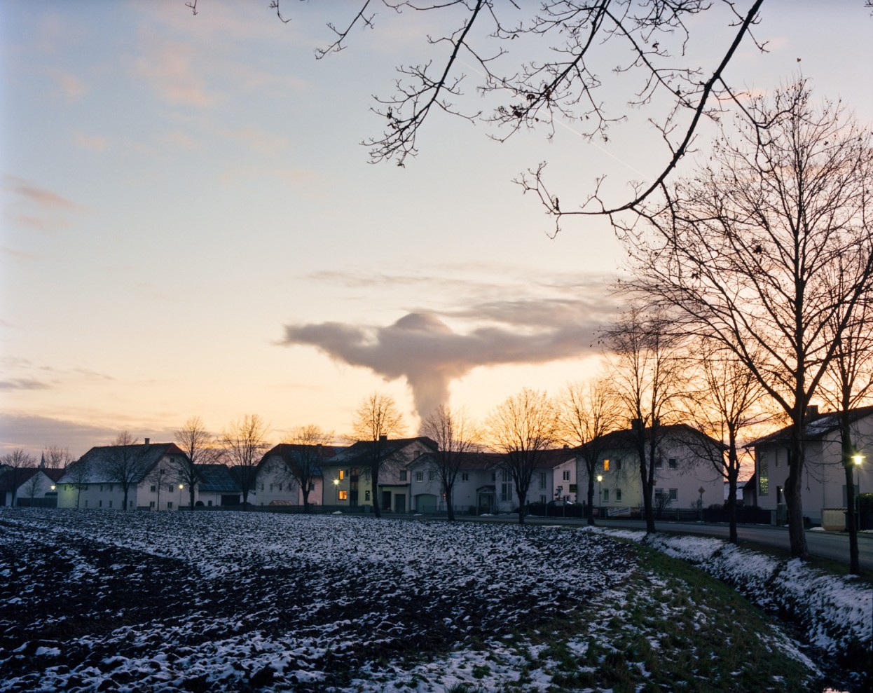 Printed on lightweight matte paper, the book starts and ends with the past. Danner includes black-and-white photographs made by German photographer Günter Zint and images from the federal police archives. The images depict the violent governmental response to the protests against the use of nuclear power in the German towns of Brokdorf, Gorleben, and Wackersdorf in the 1970s and 1980s. The opening begins with a flock of helicopters in an overcast sky, hovering over a field where, in the distance, human specks gather on the horizon. The following pages show rows of police wielding riot shields as they march behind a military truck, or a cluster of them standing in wait by a contrastingly ordinary house whose residents observe the commotion through the windows; a man standing on a small hill who turns to protect himself from an eruption of debris; hordes of helmeted squads looking bored; and a man being dragged on the ground while a nearby officer comfortably rests his hands on his hips and looks off in the distance. The final black-and-white image faces the first contemporary color image by Danner. In Zint’s image on the left, a line of protestors carries a flag down a road. Danner’s image on the right of the same town, twenty years later, abruptly transports us to the present.
