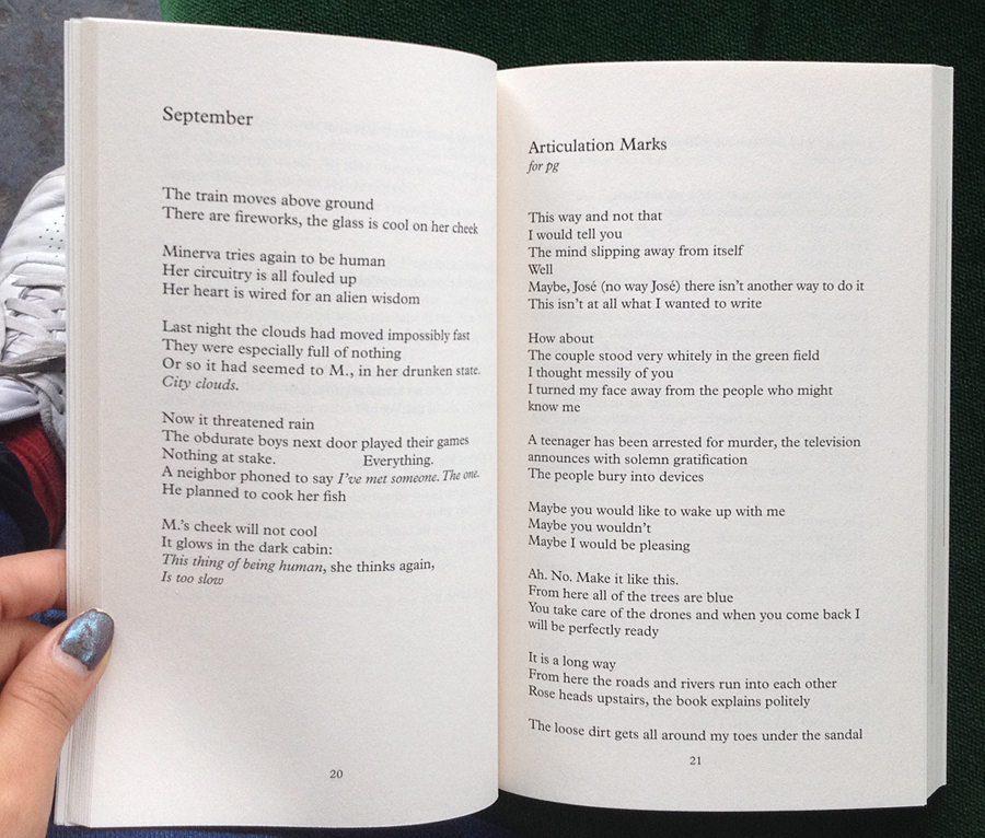Similarly, the words from the essay “On Taste” get cannibalized into the poem Taste twenty pages later, and by changing the structure and cadence of the original, La Rocco furnishes the reader with a concrete example of form influencing perception. Further, by interspersing observation-based criticism with more poetic forms that reference and evoke the inner and outer life of a critic, La Rocco models a critical practice that doesn’t separate the “I” that responds from an “I” that imagines—the receptive, reciprocal quality is suffused into everything here.