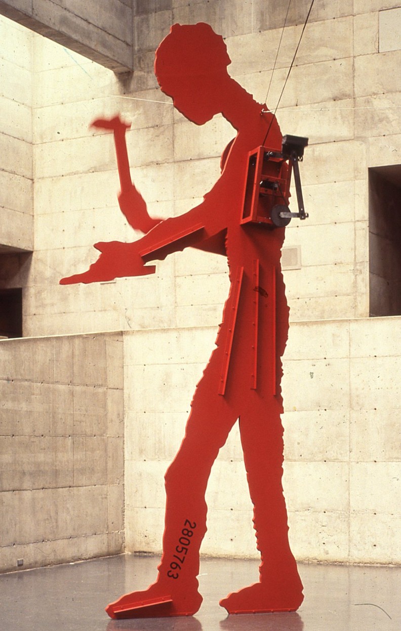 [Figure 3] Jonathan Borofsky. Hammering Man, 1976–1983; wood, paint, steel, aluminum, foam, Bondo, and motor. Purchased with the aid of funds provided by the National Endowment for the Arts, the UC Berkeley Art Museum Council, its members, and friends. Courtesy of BAM/PFA.