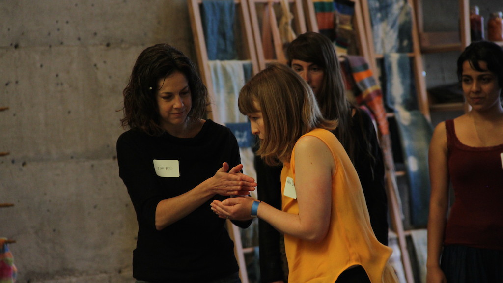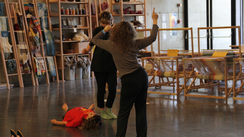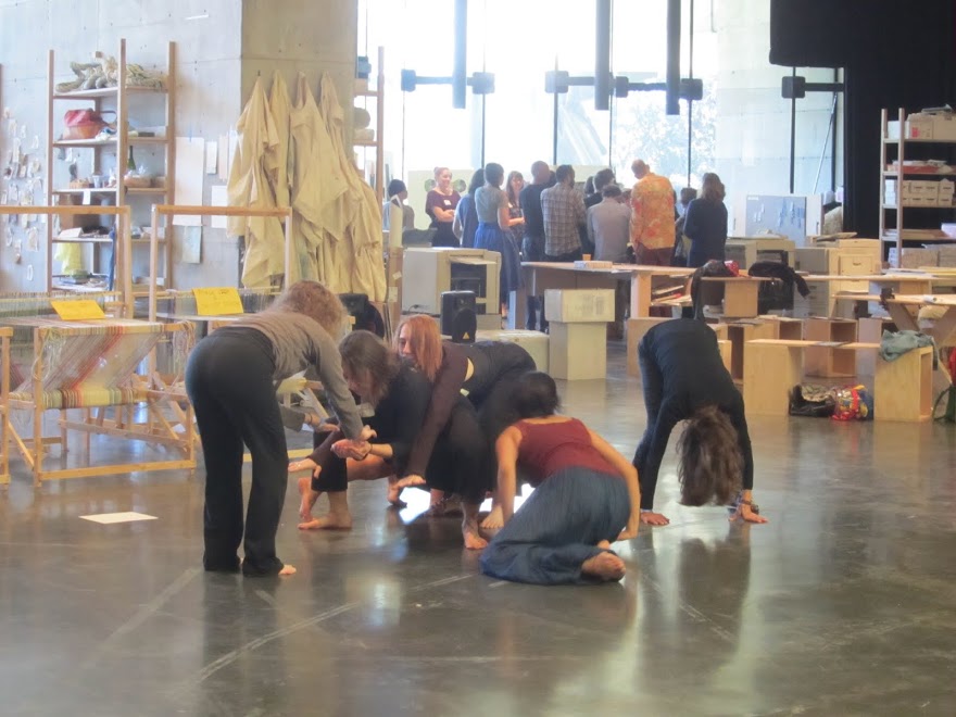 The workshop I attended, choreographer and dancer Sara Wookey’s “Collective Actions, Moving Thought,” explored gesture as a mode of nonverbal knowledge production. She asked us to designate a performance arena in the middle of a large gallery and then move to a series of prompts she asked us to meditate on using actions instead of words; one was the word “labor,” and gradually the clunkier, literal motions like jumping jacks or robotic jerks gave way to a fluid dynamic between and among bodies, as some came together to improvise and build engine-like human/machine hybrids [fig.1]. The more expected embodied responses—those that signaled diligence, exertion, endurance, and repetition, somewhat akin to the task-based dance of minimalism—were interspersed by those that performed acts of care, comfort, and tenderness (notably initiated by women) [fig. 2].