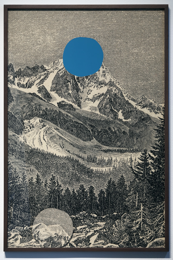 Back in the Gatehouse Gallery, Walker employs isolation to a similar end in the fallibility of intent with cutout surrogates of rocks and mountaintops that appear in multiple series in the artist’s exhibition. At times adhered directly onto a rock as in the series a paradox in distance (inverted) (2014) and the plight of inconsequence (2014), while at others held up between fingers, or on a large tongue depressor to align with a mountain’s distant silhouette, the paper stand-ins at once obstruct a true photographic depiction of the land formation and concurrently illuminate the artist’s own yearning. Walker’s is an earnest slapstick; the paper cutouts are as obvious a pretense as Walker could guard against, though they represent the only tools we have at our disposal to bring the land within our grasp. The roughly cut paper around each vignetted summit is human-made and -mobilized—crudely aware of its own limits but instructive nonetheless. Like language, these renderings may be far from sensorial perception, but they enable the relativity that produces communication.